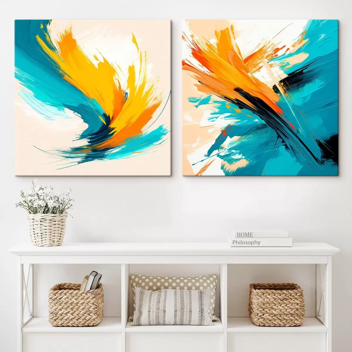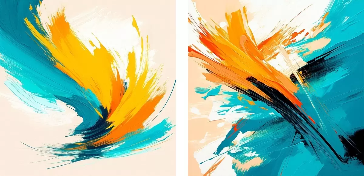Maalid Dünaamilised pintslitõmbed türkiisi-oranžis värvipalettis kaasaegses kunstistiilis Nr m30354