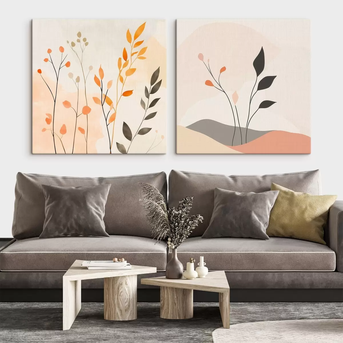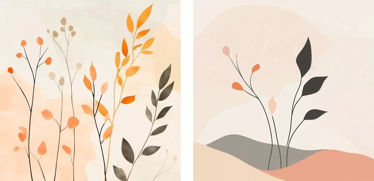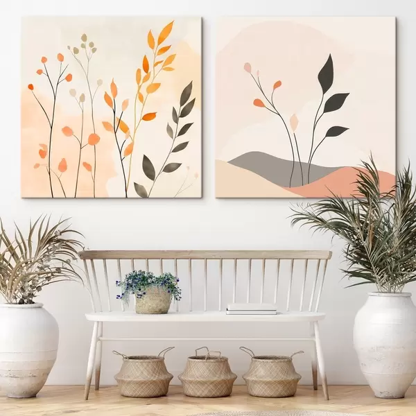 Maalid Lilleline diptühhon soojades beež-koralltoonides, millel on minimalistlikus stiilis graafilised jooned Nr m30363