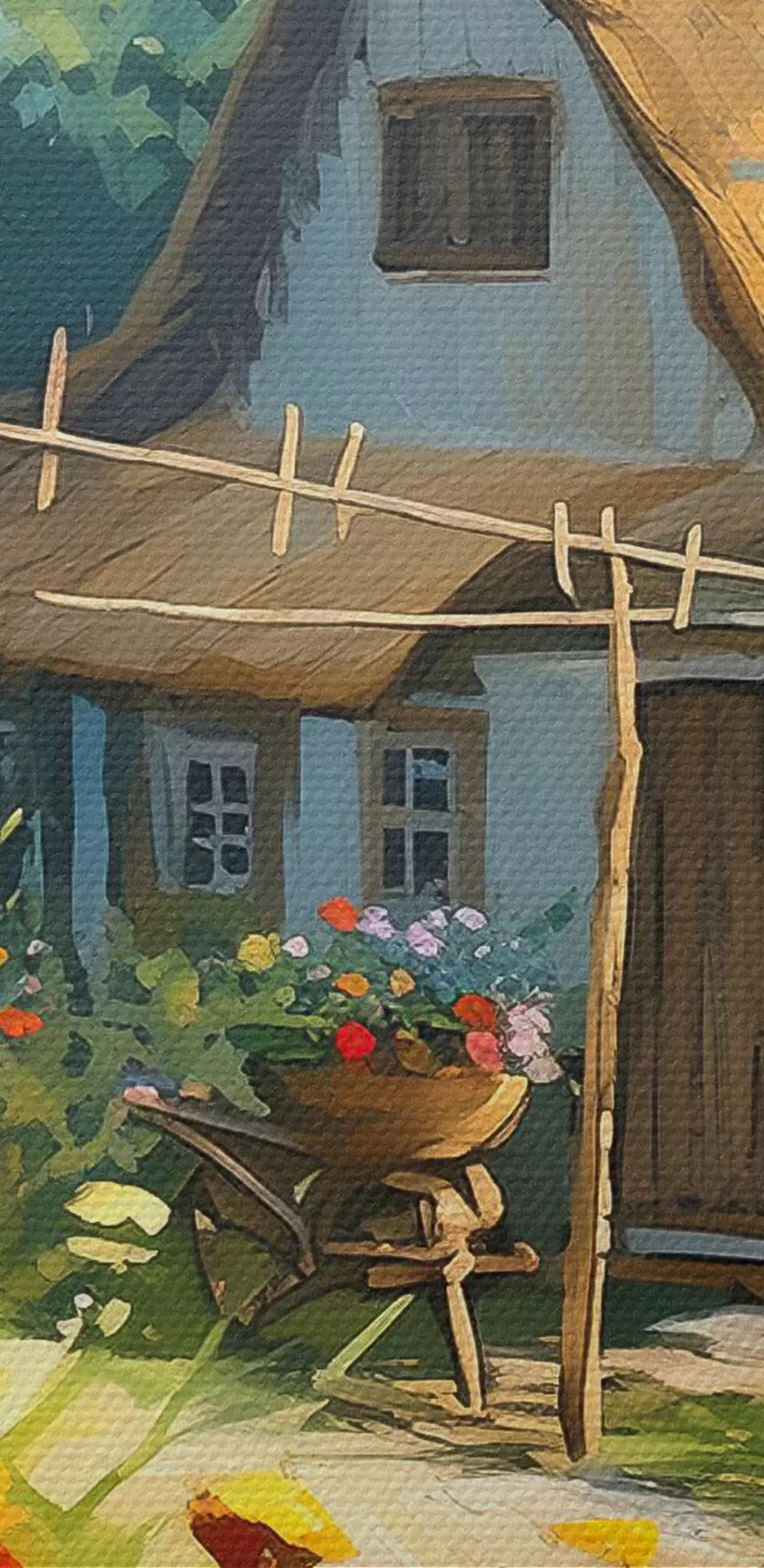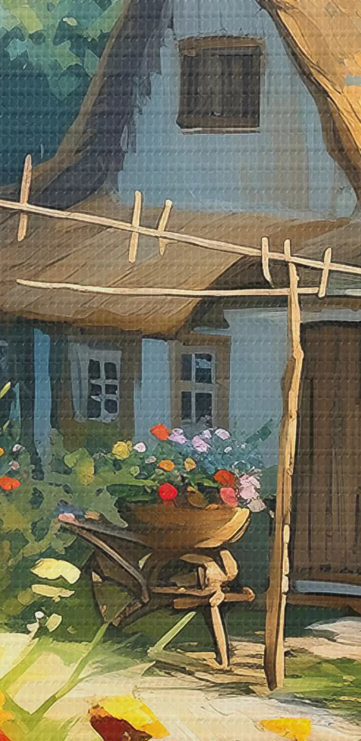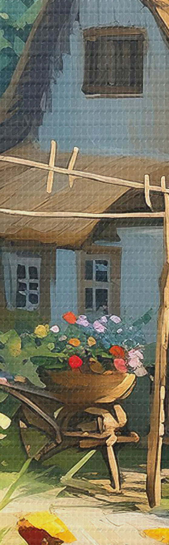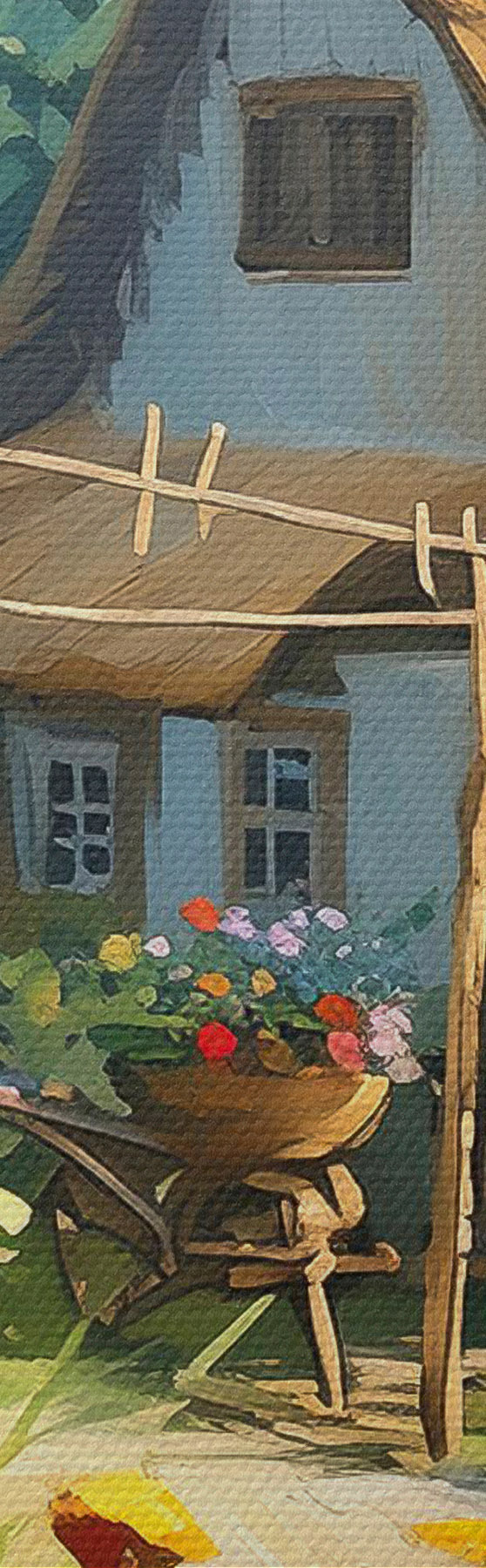 Maalid Aiaga külamaja, suvelilled, oliilvärv, pintslitõmme, põld, rustikaalne stiil Nr s38491