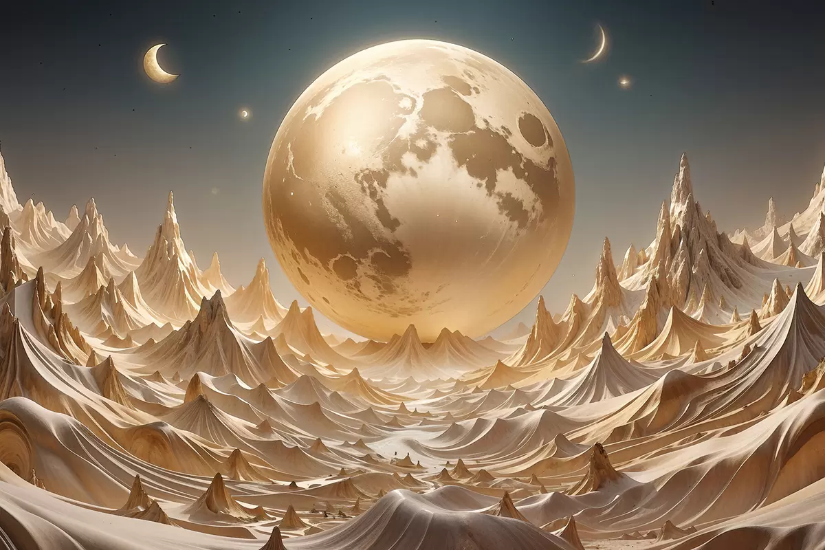 Pilt Hõõguv täiskuu kuldsete tippudega sürrealistliku mägise maastiku s38775