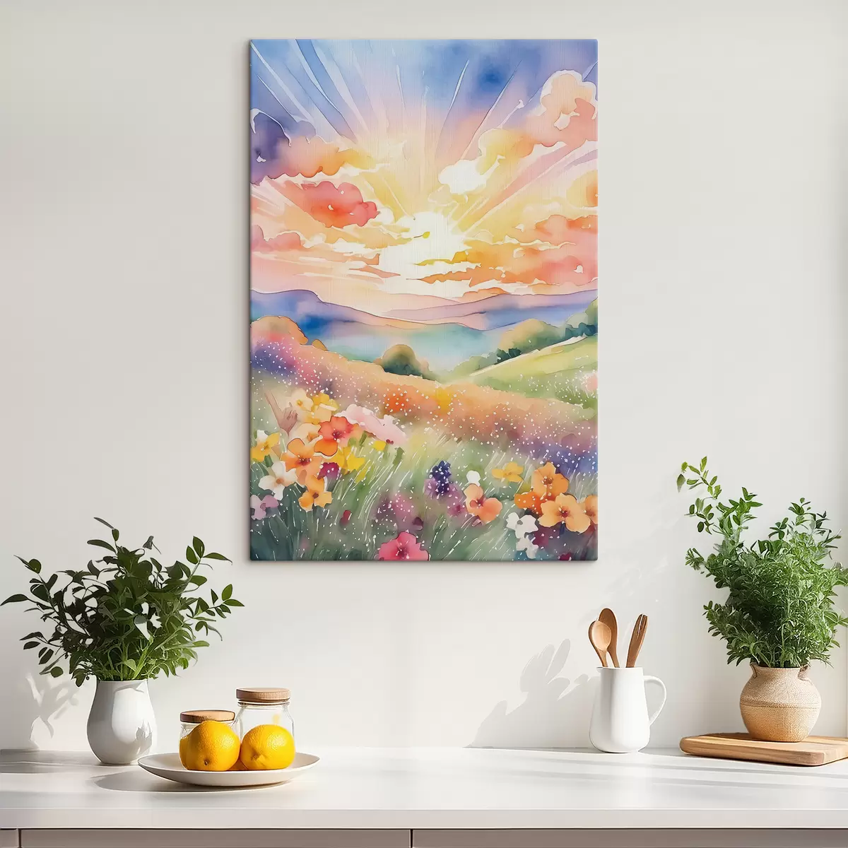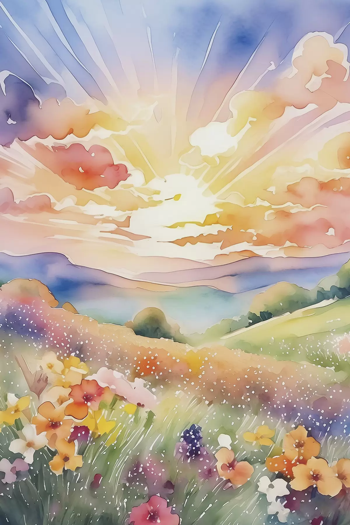 Maalid Päikeseloojang suveväljal, lilled, päike, värviline taevas, pilved, loodus Nr s38842