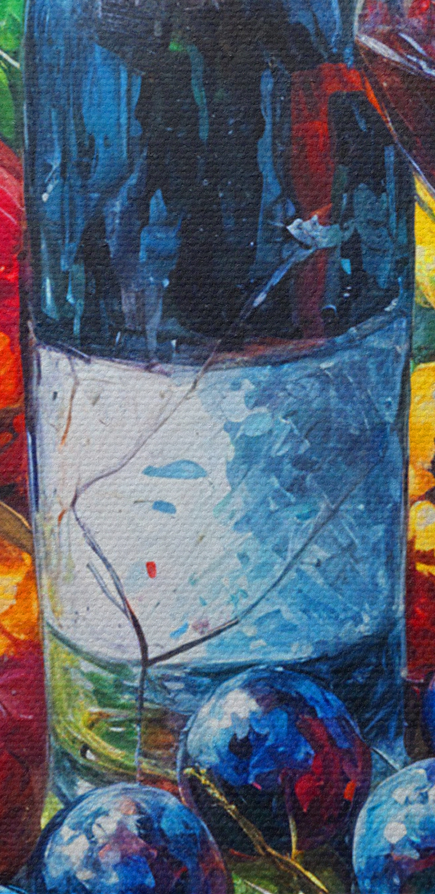 Maalid Abstraktne natüürmort veinipudelist, veiniklaasist ja värvilistest puuviljadest erinevat värvi pritsmetega Nr s38958
