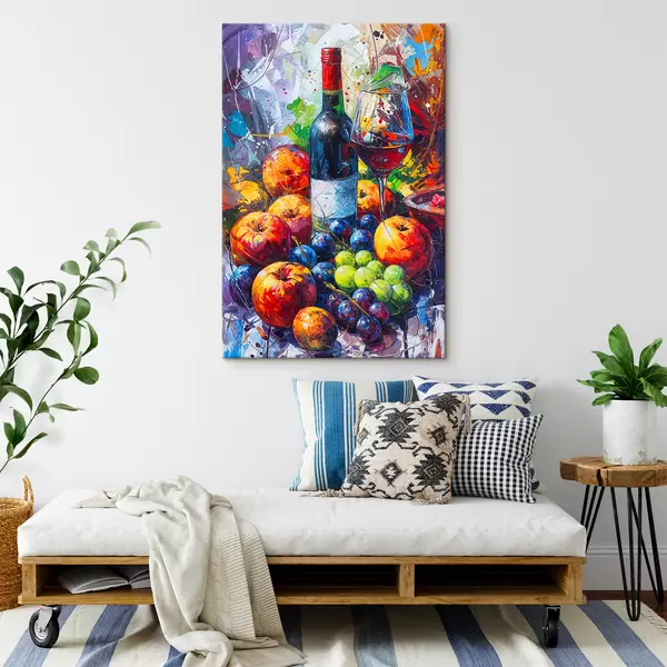 Maalid Abstraktne natüürmort veinipudelist, veiniklaasist ja värvilistest puuviljadest erinevat värvi pritsmetega Nr s38958