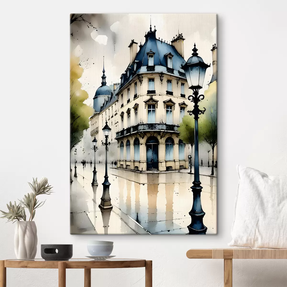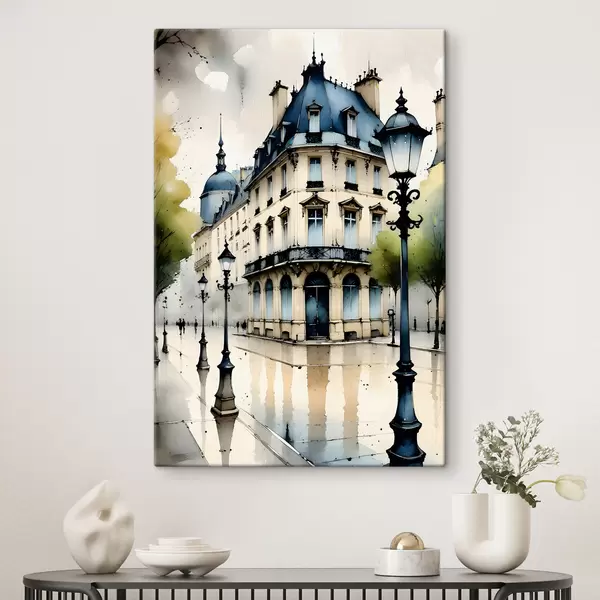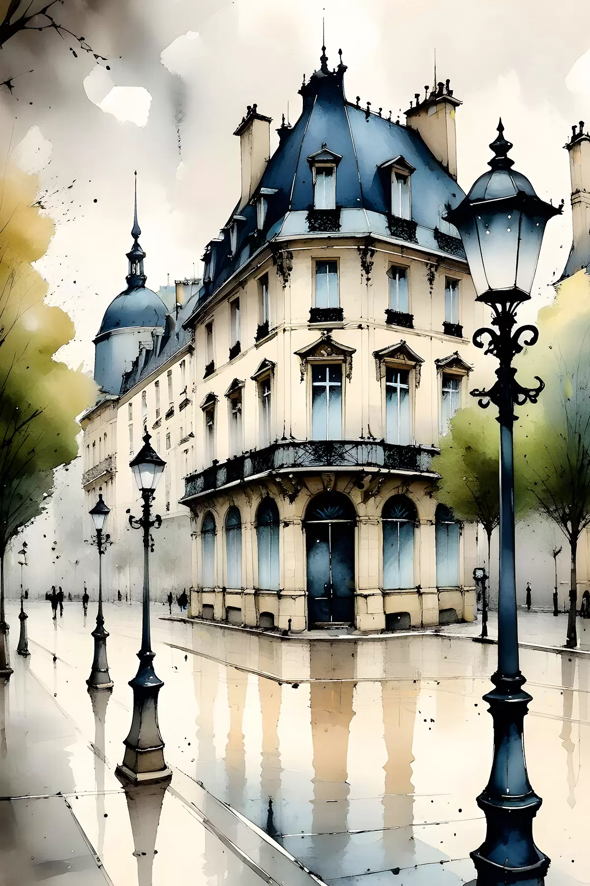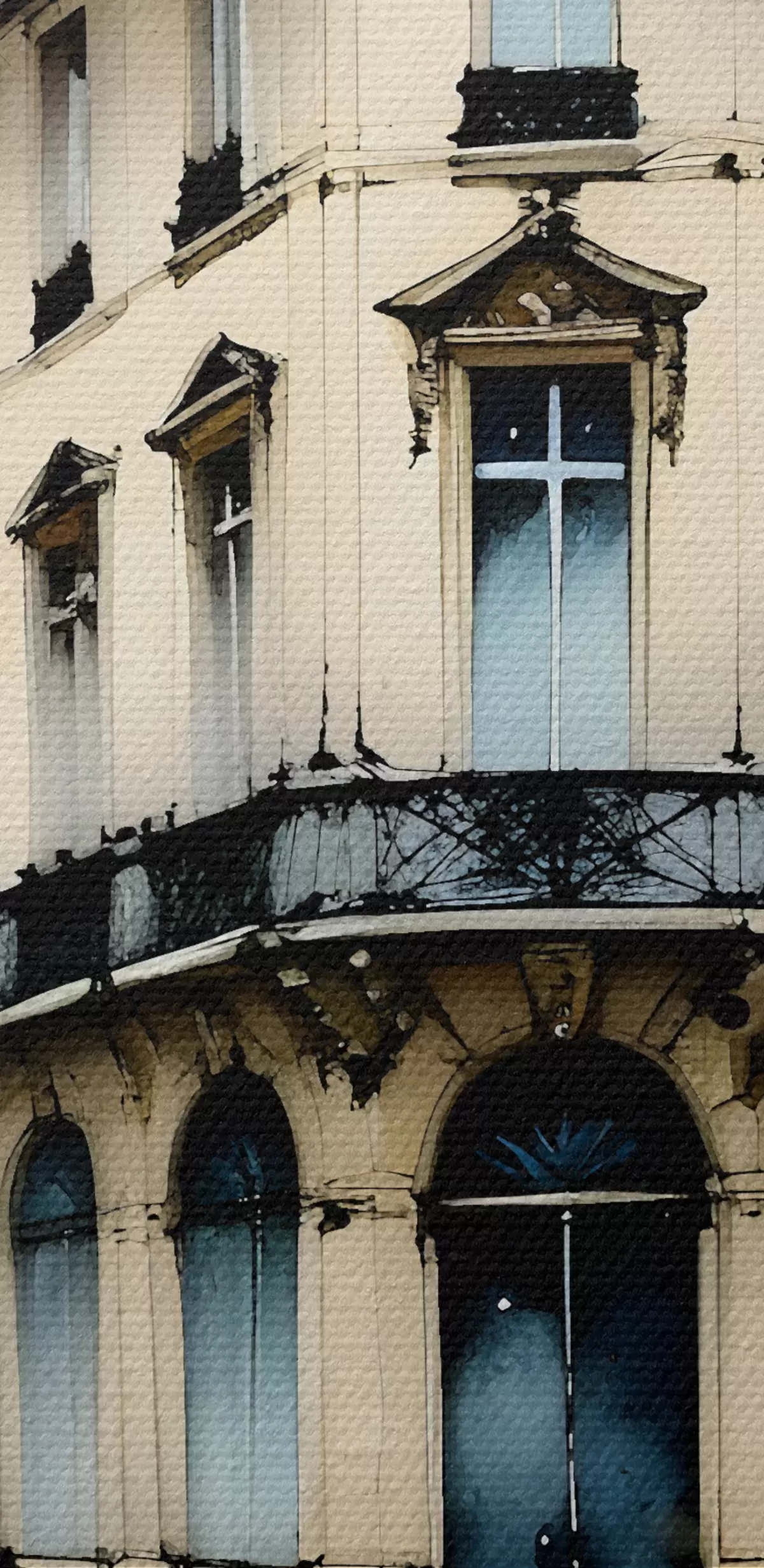 Maalid Kumera fassaadi ja dekoratiivsete arhitektuursete elementidega ajaloolise hoone akvarellmaal Nr s38975