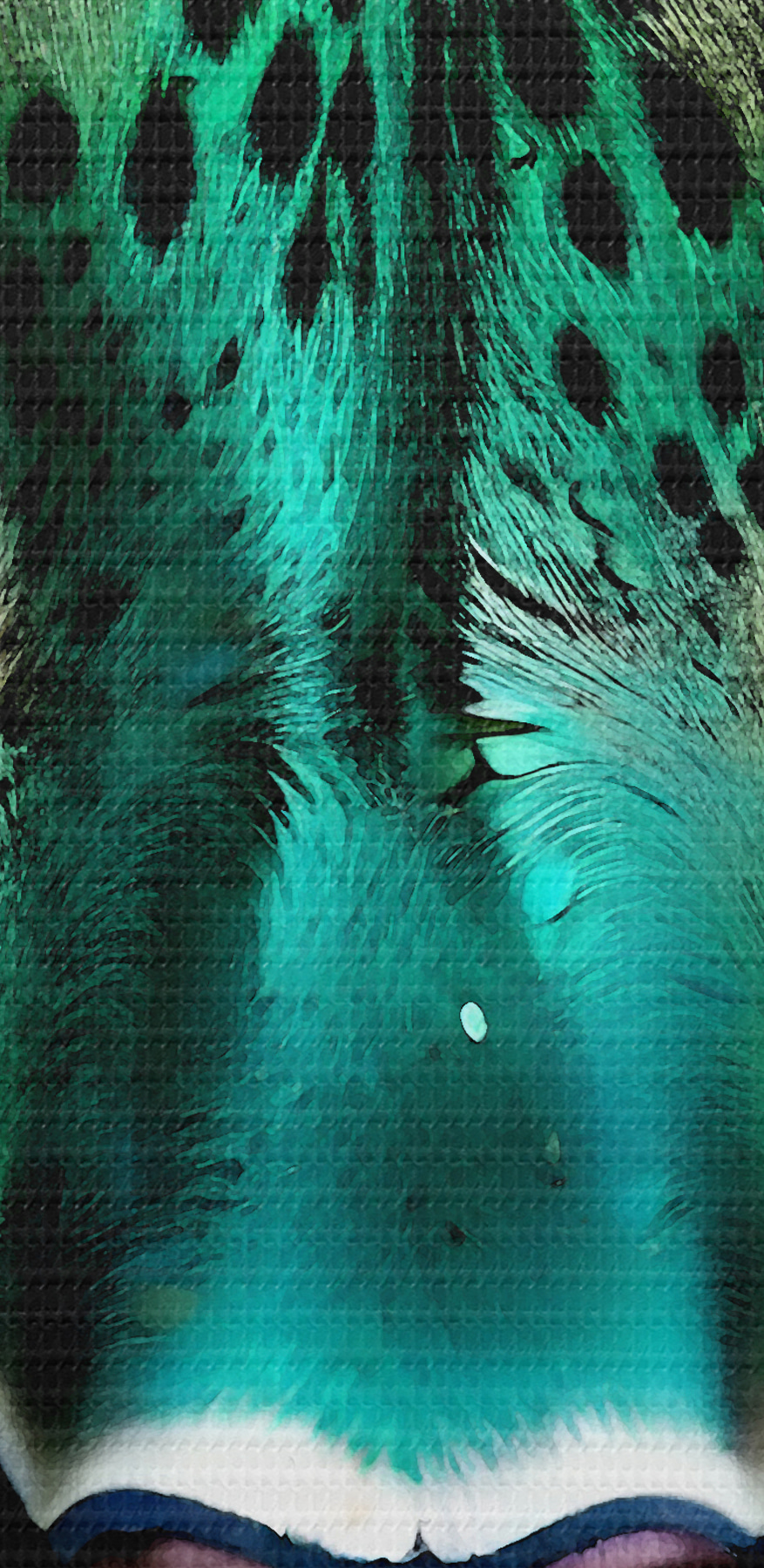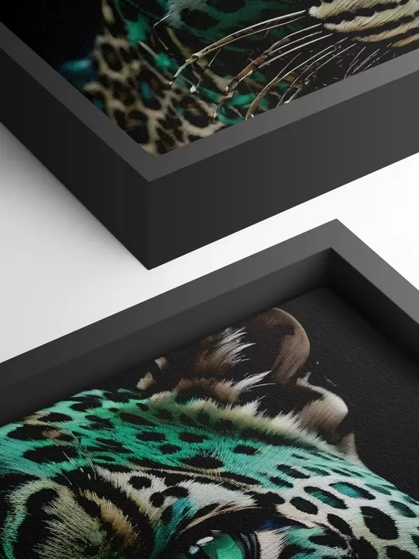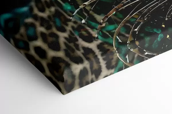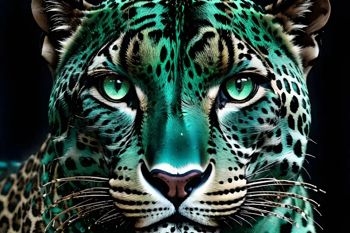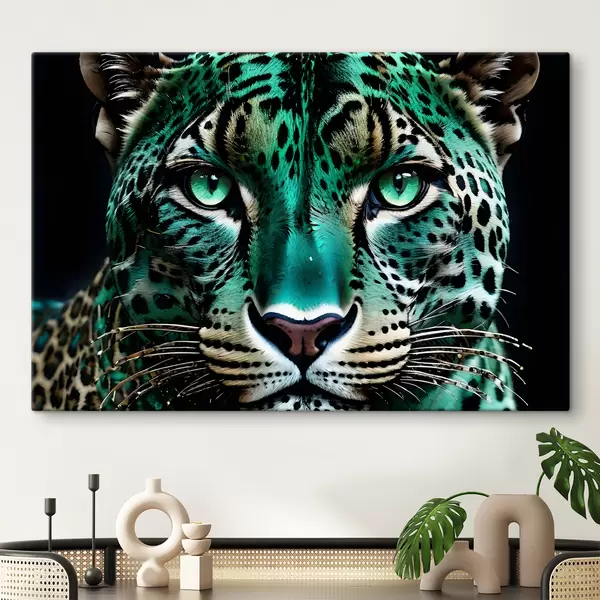 Maalid Lähivõtte portree ägedast roheliste silmadega leopardist, millel on särtsakas türkiissinine ja mustalaiguline karv Nr s38979