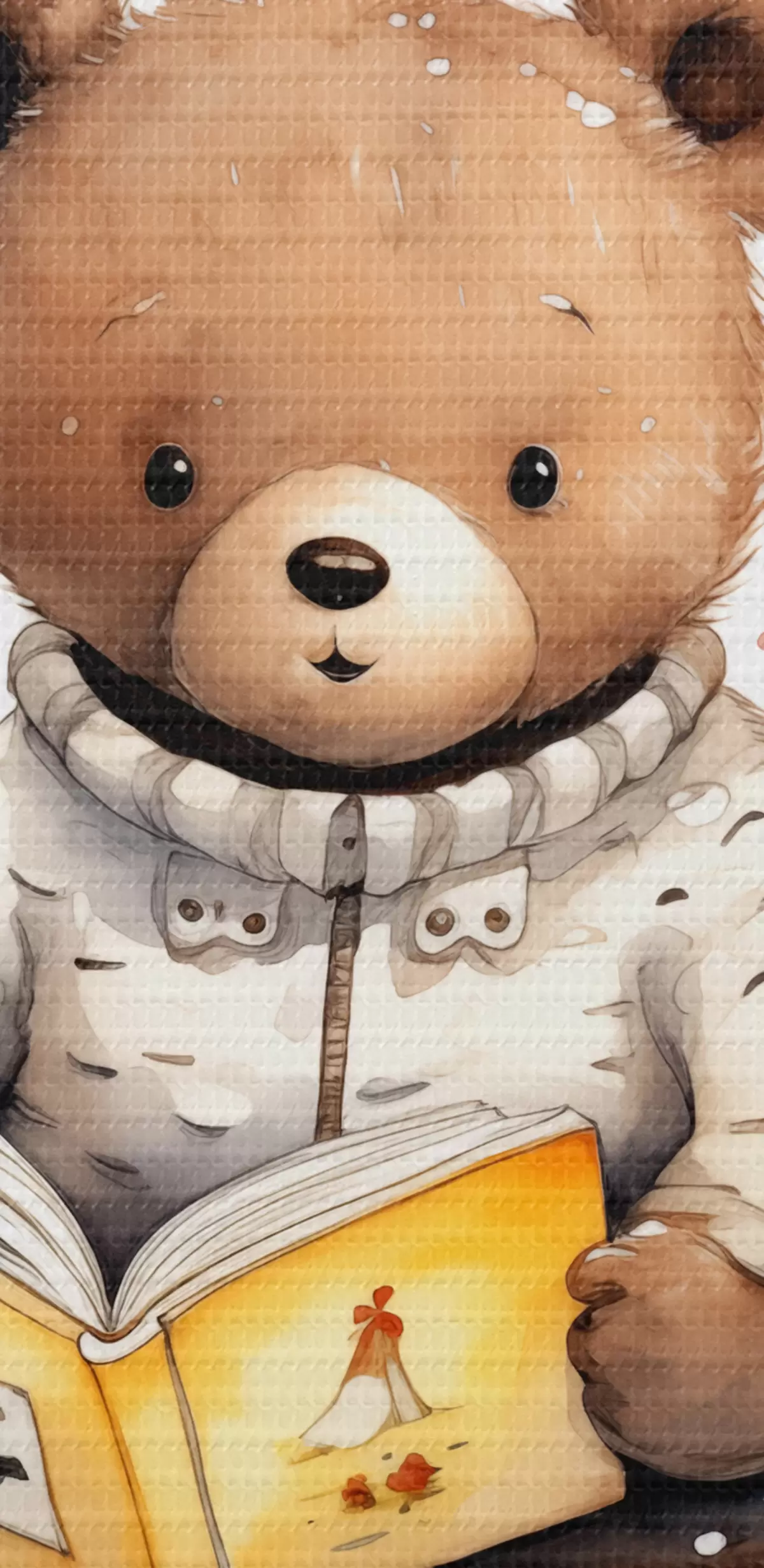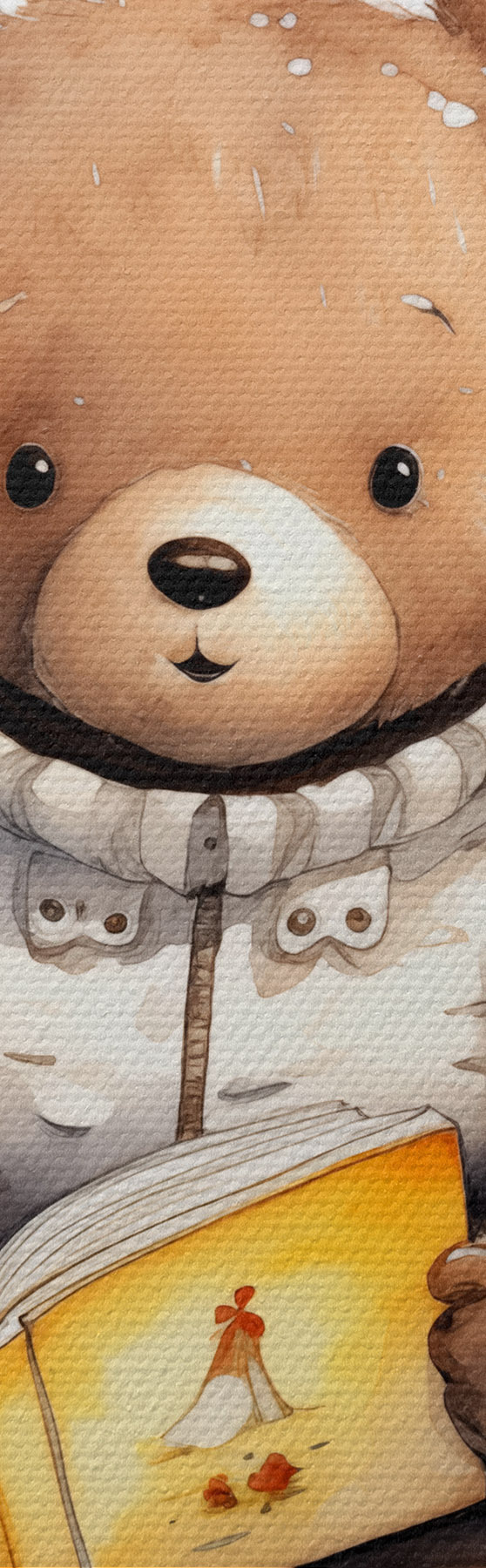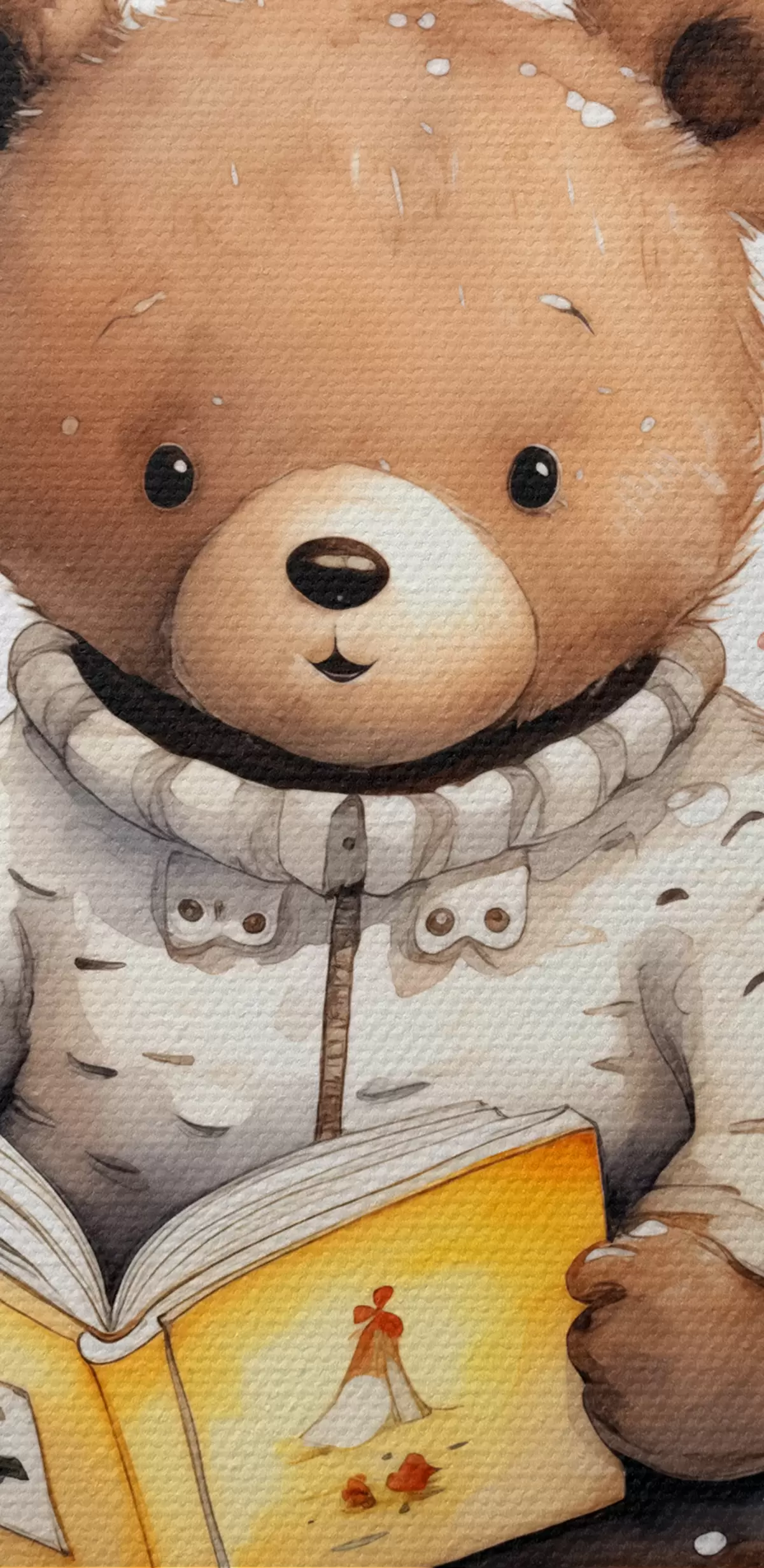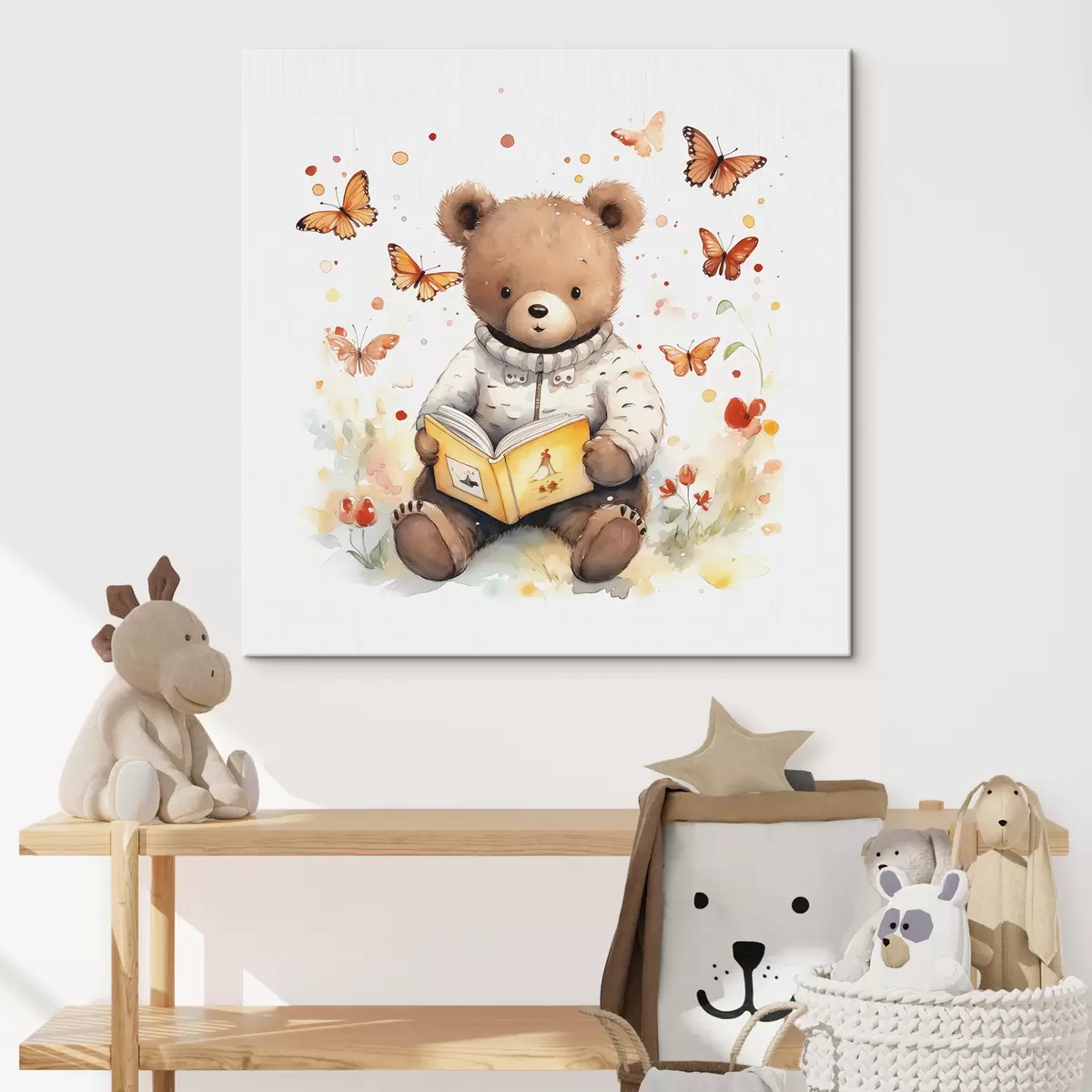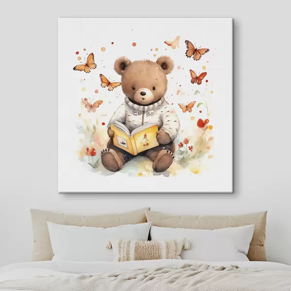 Maalid Kampsunis pruunkarupoeg loeb akvarelliliblikatest ümbritsetud raamatut Nr s39025