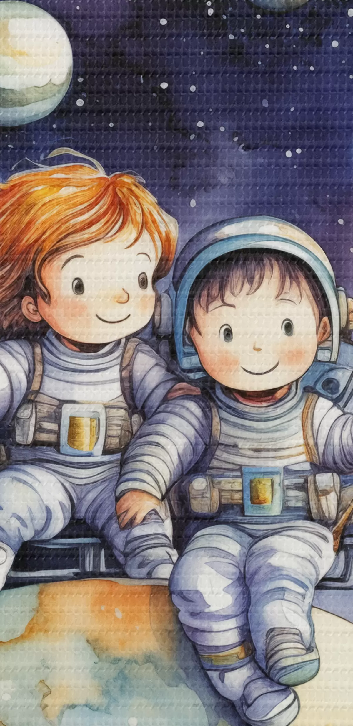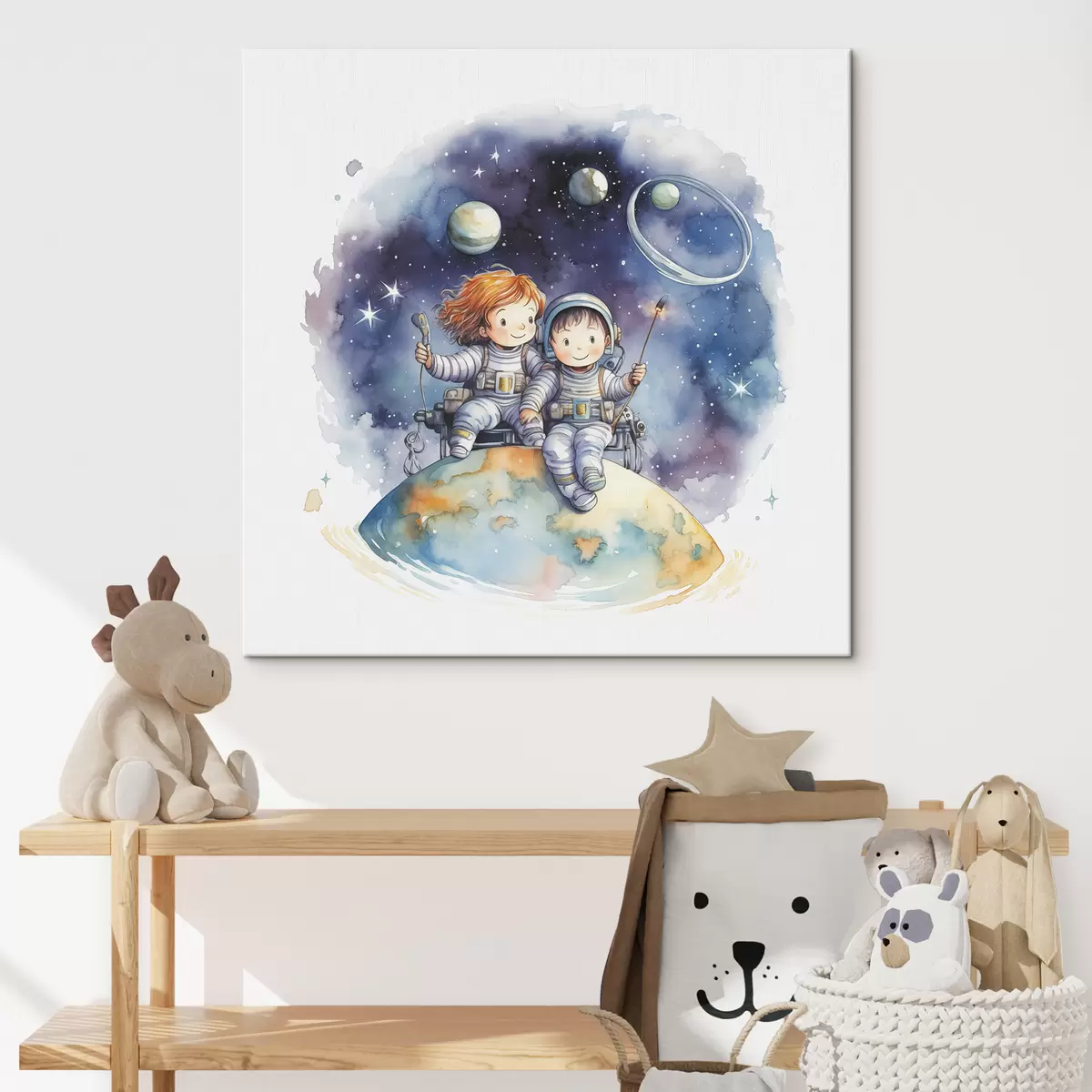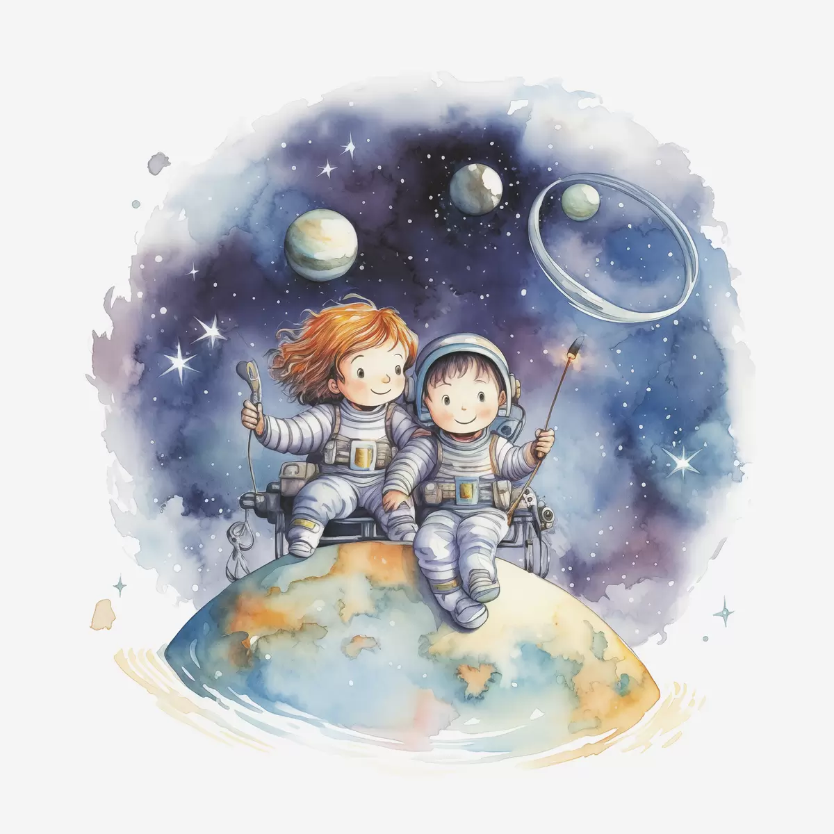 Maalid Skafandrites lapsed istuvad planeedil kosmoses, laste akvarellillustratsioon Nr s39117