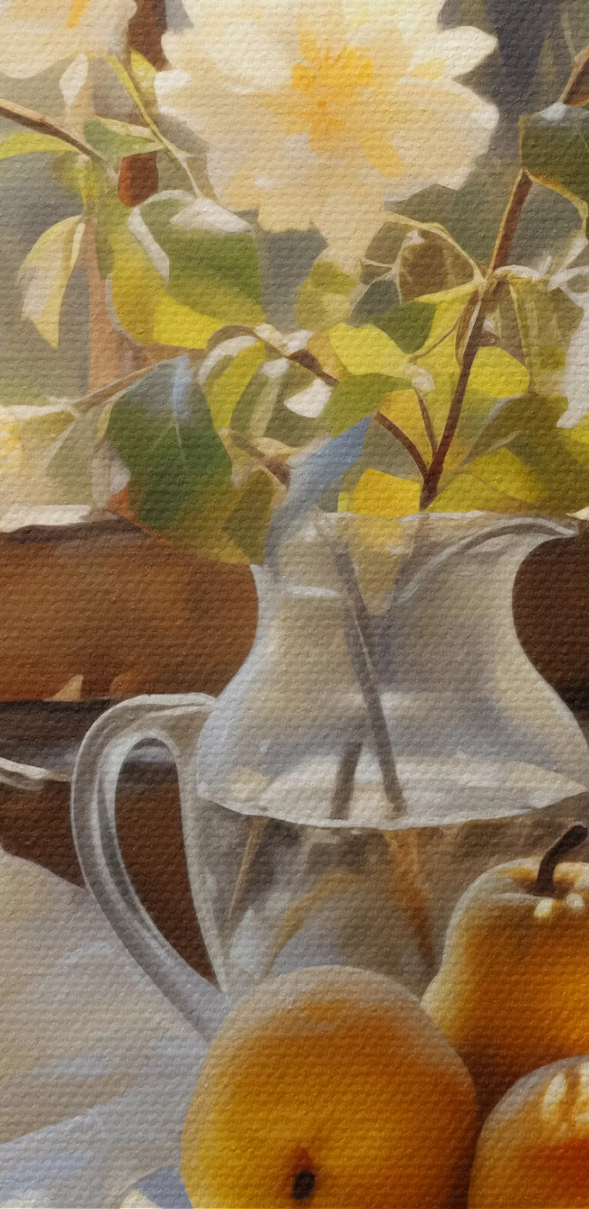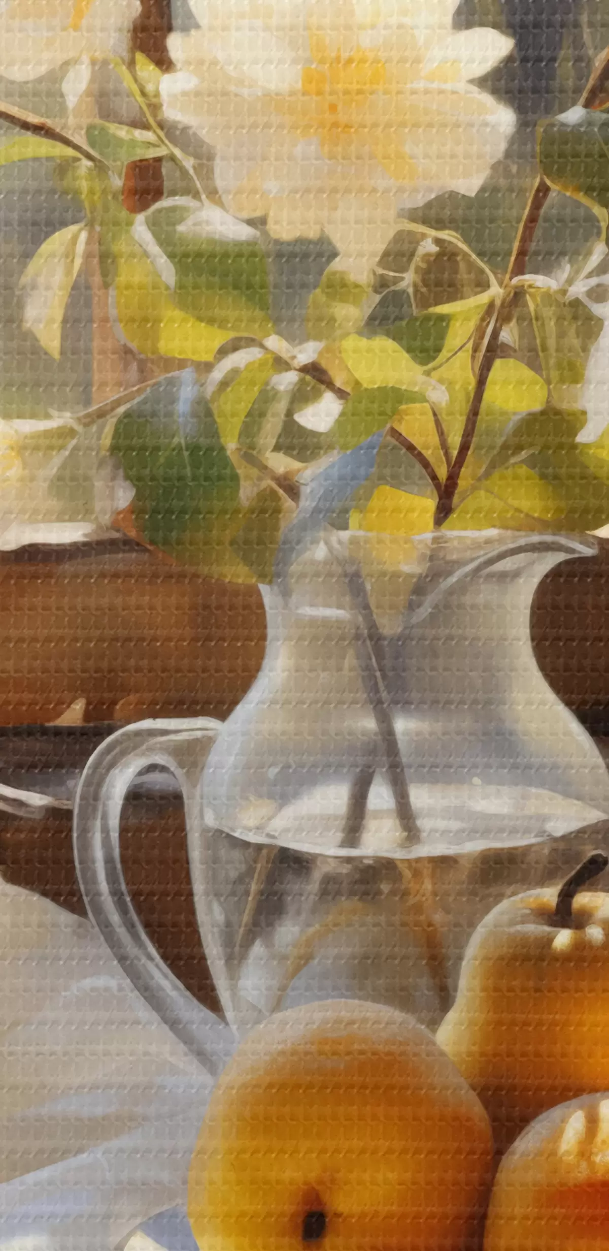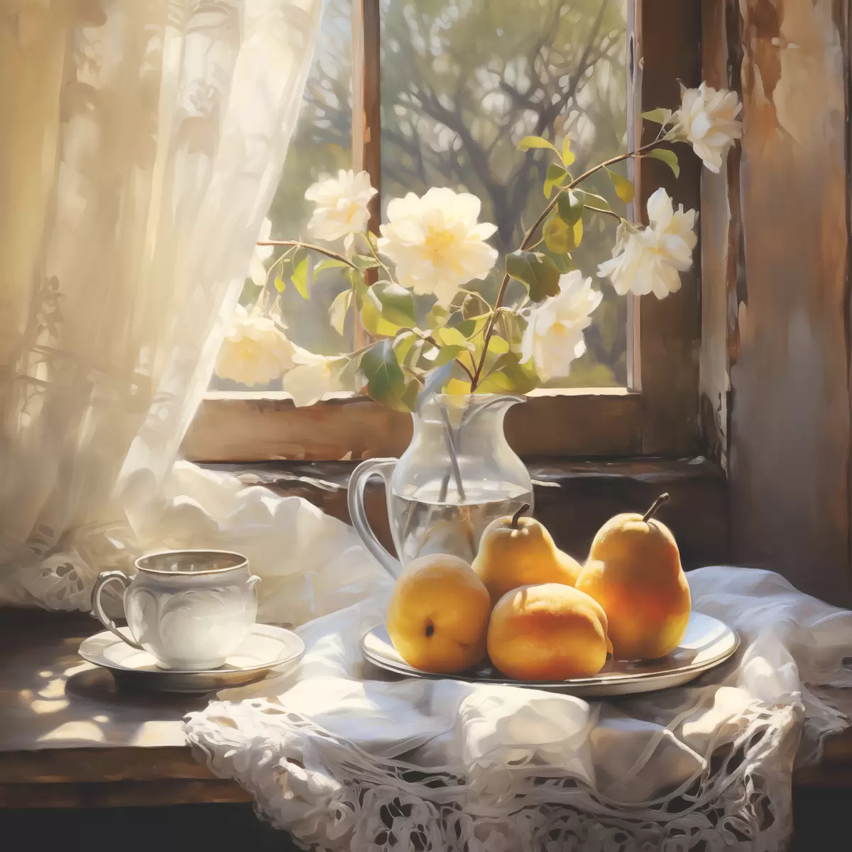 Maalid Rustikaalne natüürmort kollastest küpsetest pirnidest aknaäärsel laual taldrikul, valged roosid klaaskannus, valged pitskardinad Nr s39129