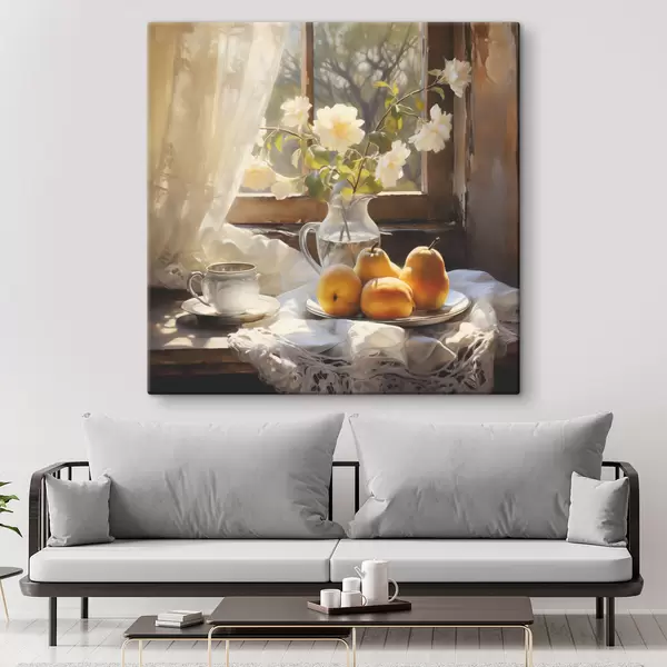 Maalid Rustikaalne natüürmort kollastest küpsetest pirnidest aknaäärsel laual taldrikul, valged roosid klaaskannus, valged pitskardinad Nr s39129