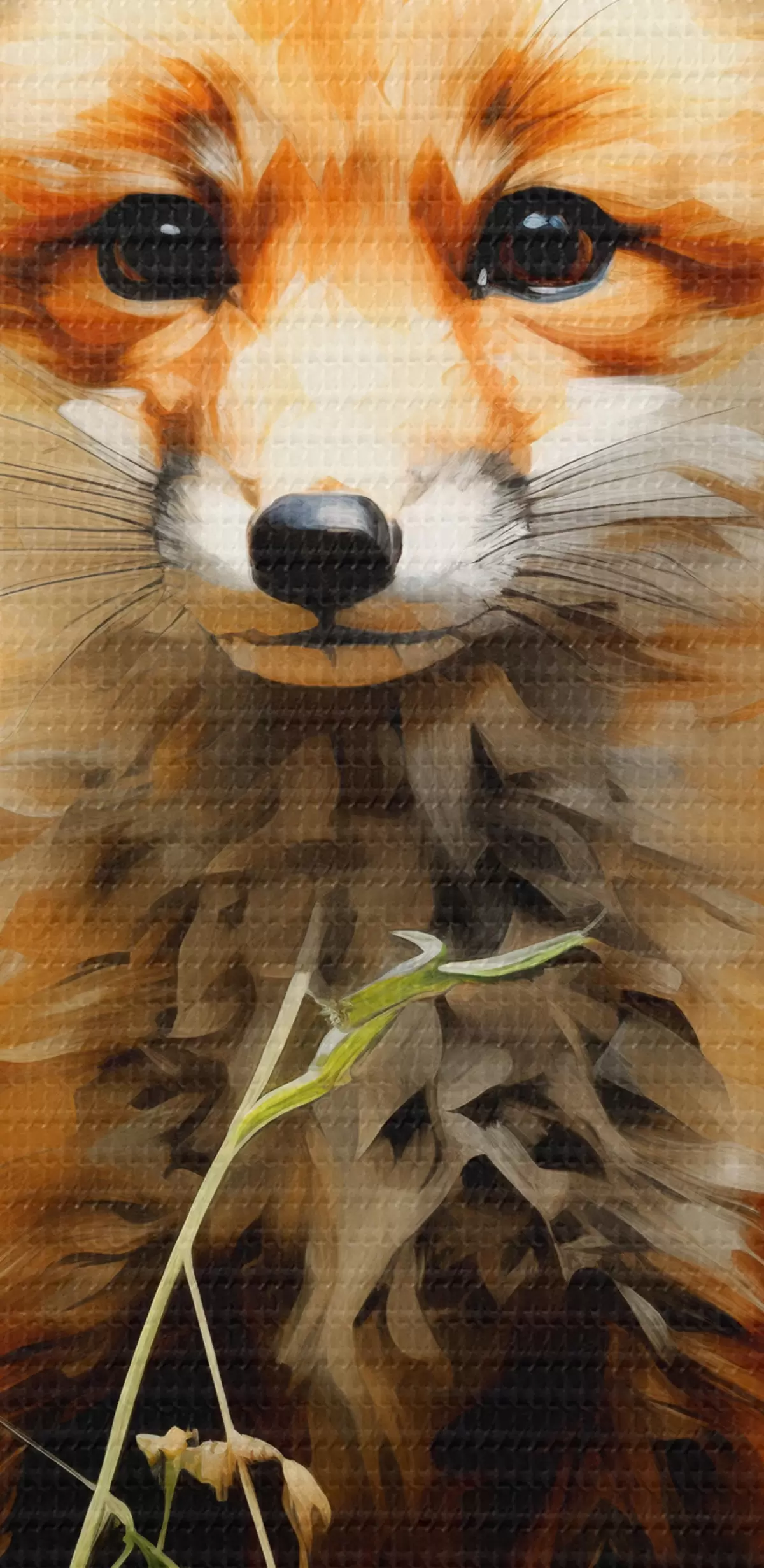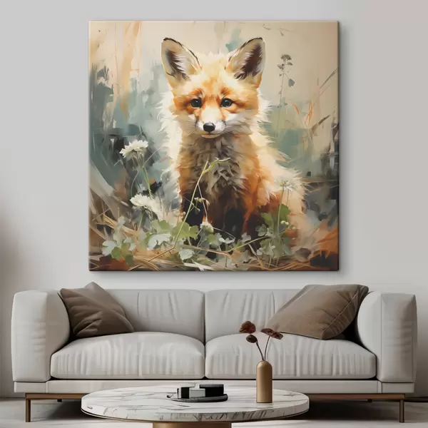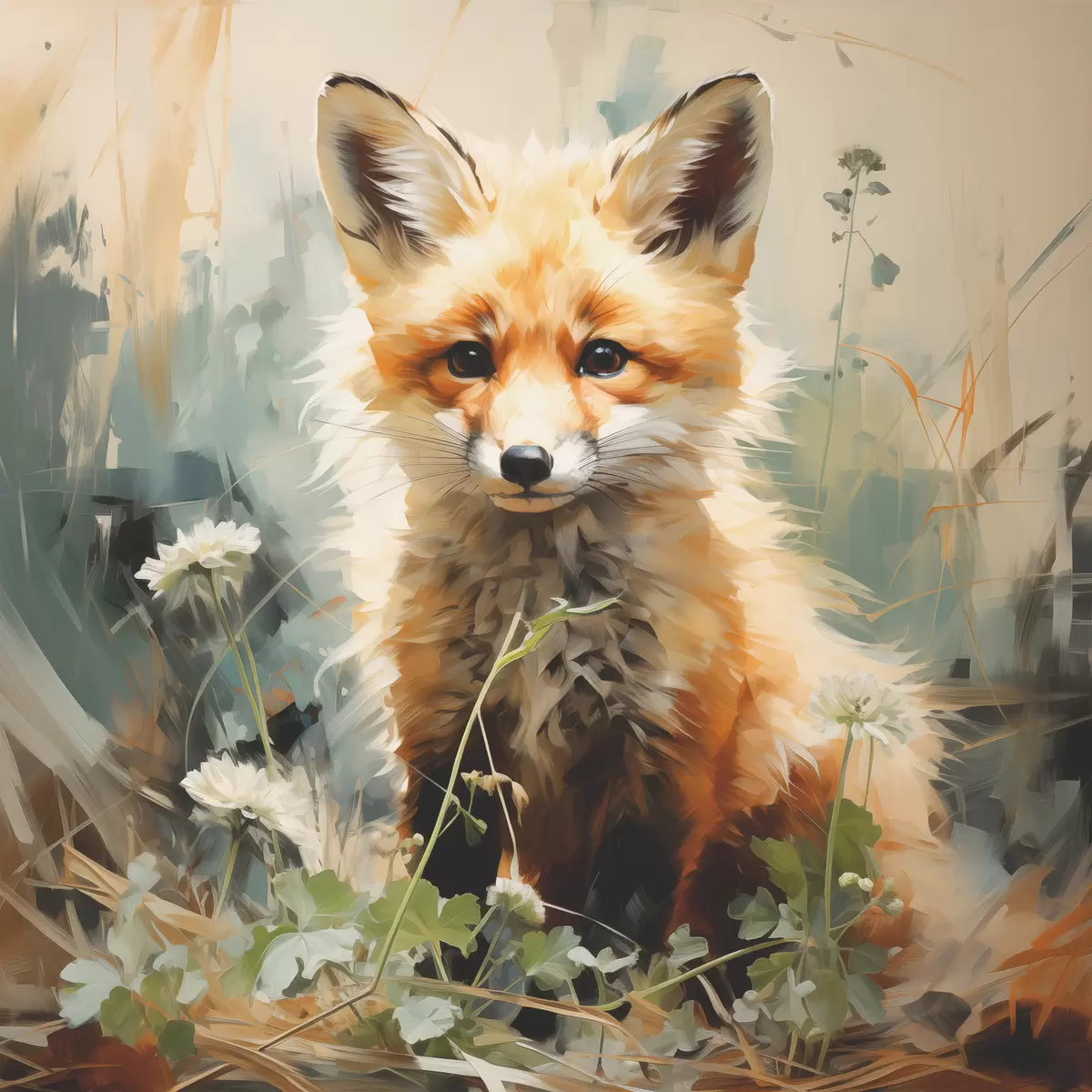 Maalid Punane rebane istub kuivas rohus rohelisel taustal õlimaal Nr s39191