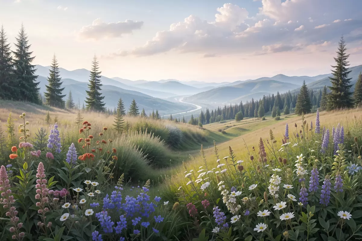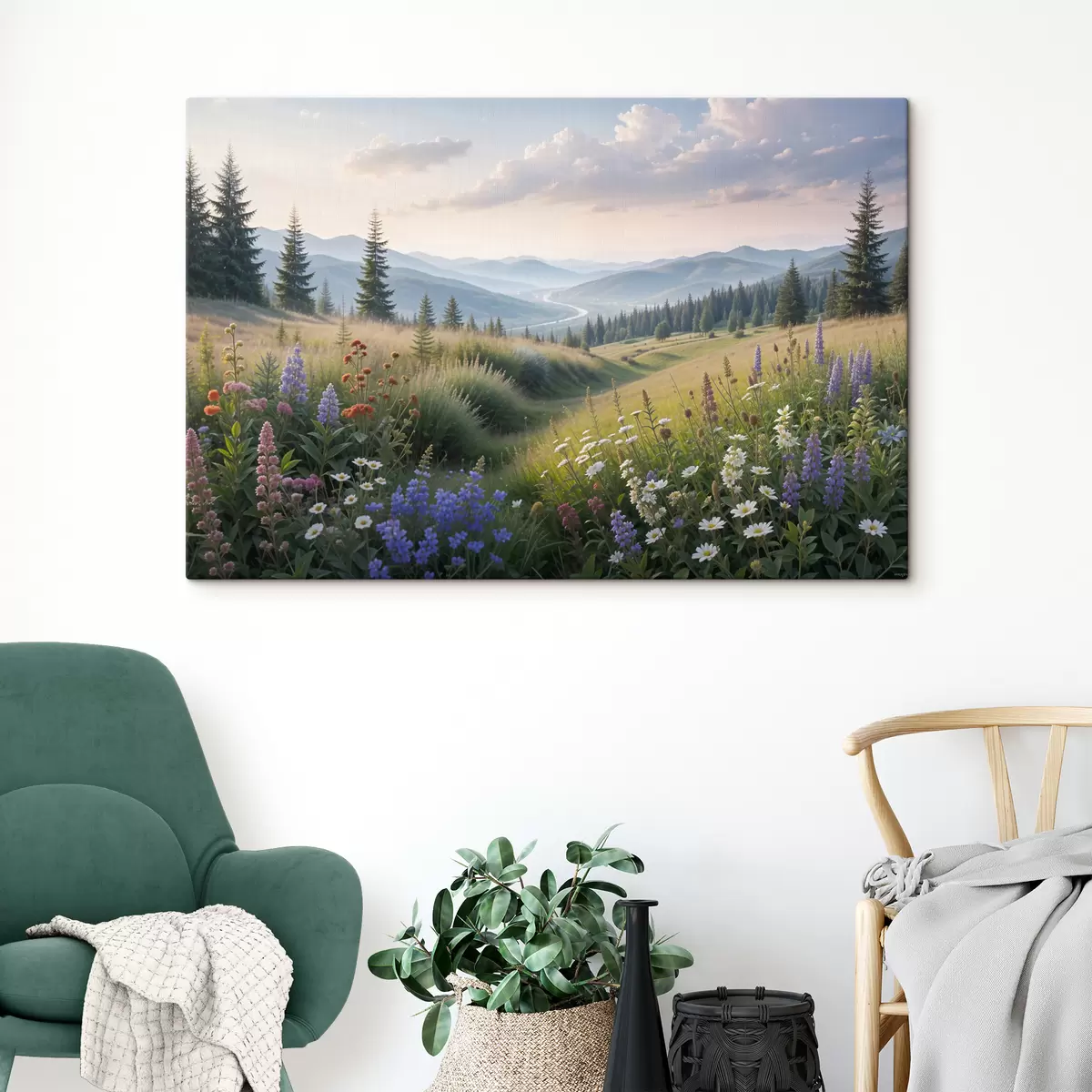 Maalid Mägimaastik, mille esiplaanil on värviliste metsalilledega täidetud heinamaa Nr s39382