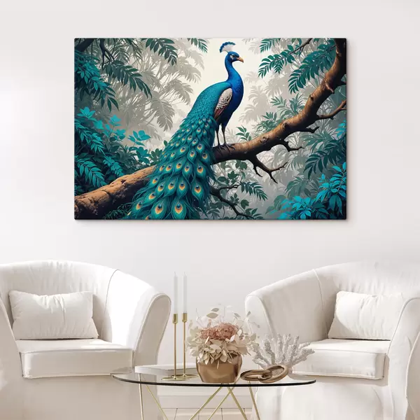 Maalid Särav sinine paabulind istus lopsakas troopilises metsas puuoksal Nr s39401