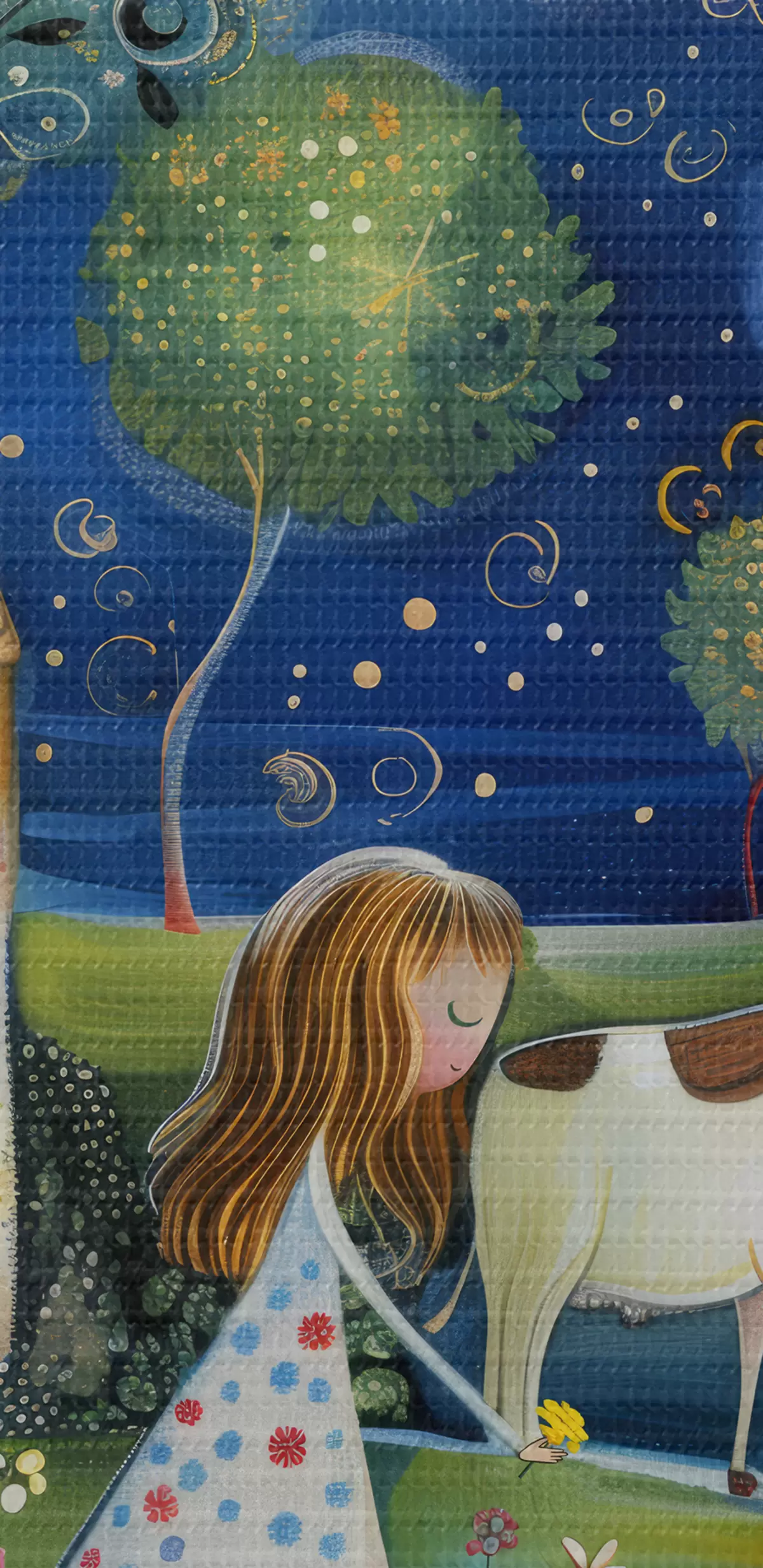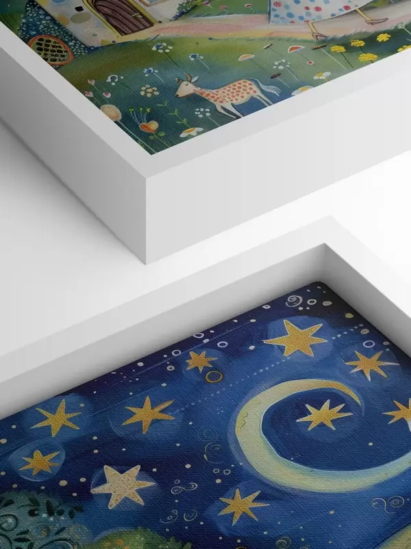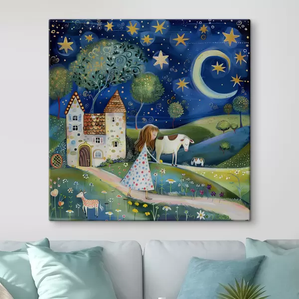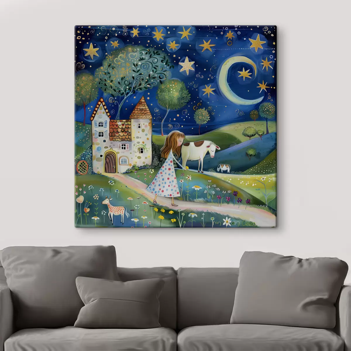 Maalid Väike printsess, koer, lehm ja fantaasiamaja tähtede all kummalises naiivses kunstistiilis Nr s39451