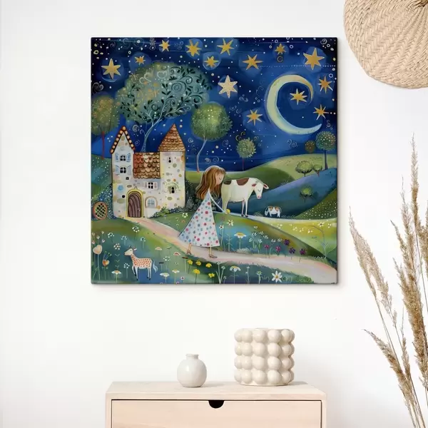 Maalid Väike printsess, koer, lehm ja fantaasiamaja tähtede all kummalises naiivses kunstistiilis Nr s39451