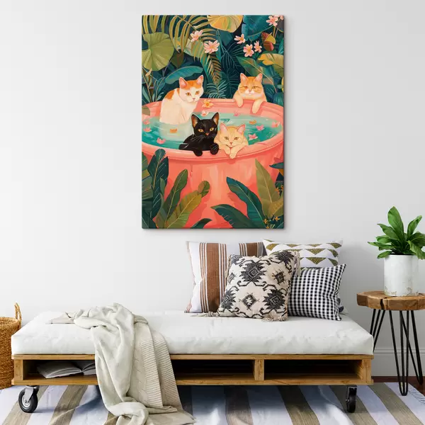 Maalid Kassid roosas vannis roheliste lehtedega, džungli atmosfäär Nr s39465