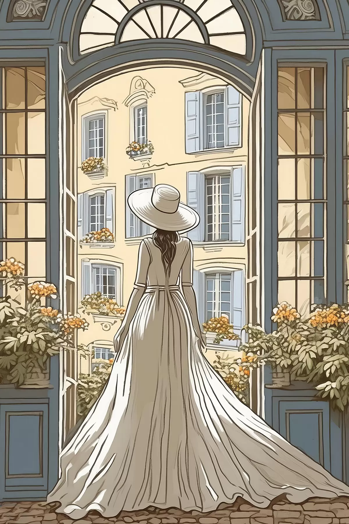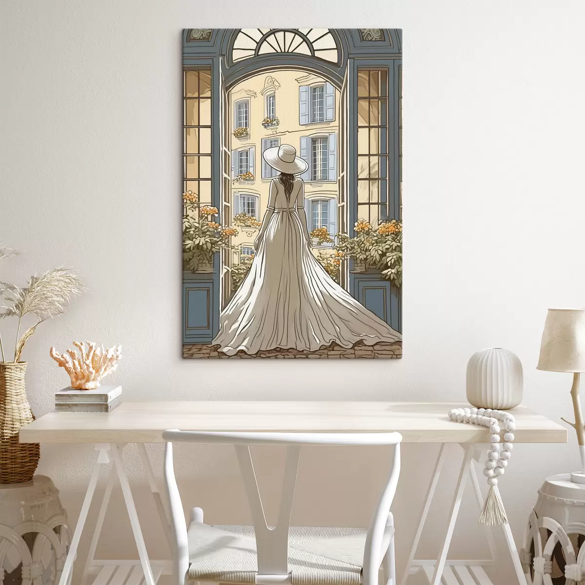 Maalid valges kleidis tüdruku siluett akna ääres Nr s39479