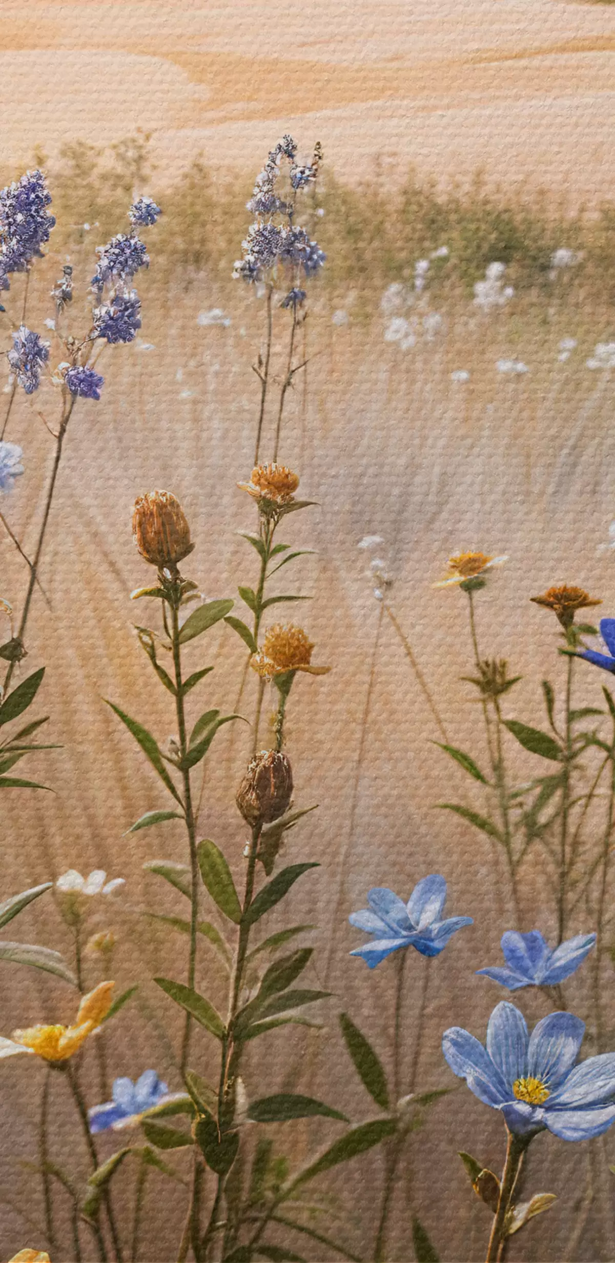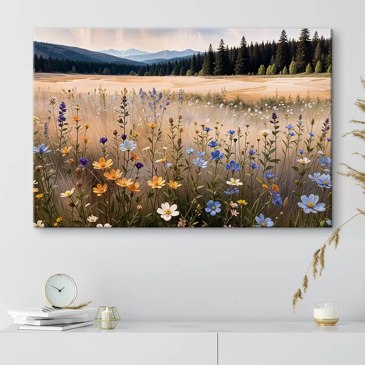 Maalid Esiplaanil värviliste metsalillede põld, taamal järv ja mäed Nr s39502