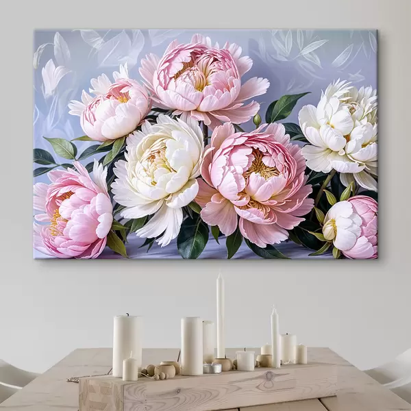 Maalid Suurte, lopsakate roosade ja valgete pojengiõite kimp roheliste lehtedega pehmel udusel taustal Nr s39514