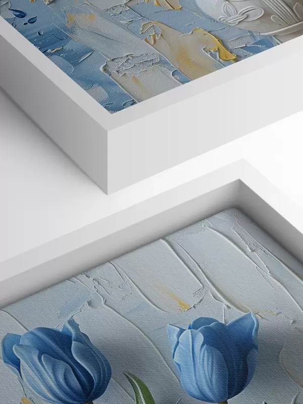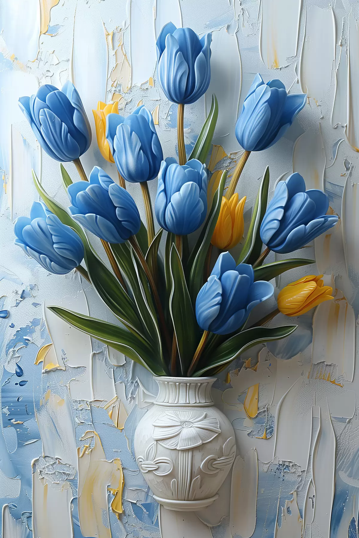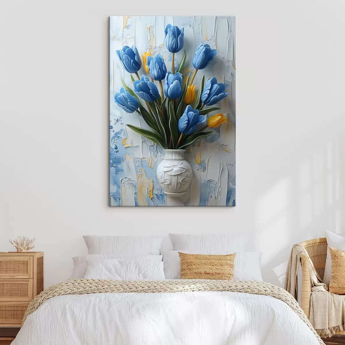 Maalid Sinised ja kollased tulbid 3D-s: elegantne õlivärviga seinapilt valge ja helesinise taustaga ning graveeritud vaas Nr s39637