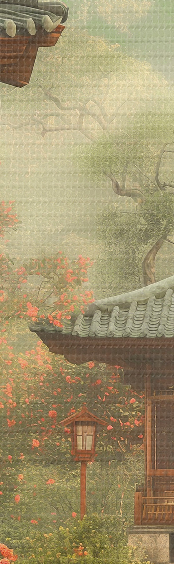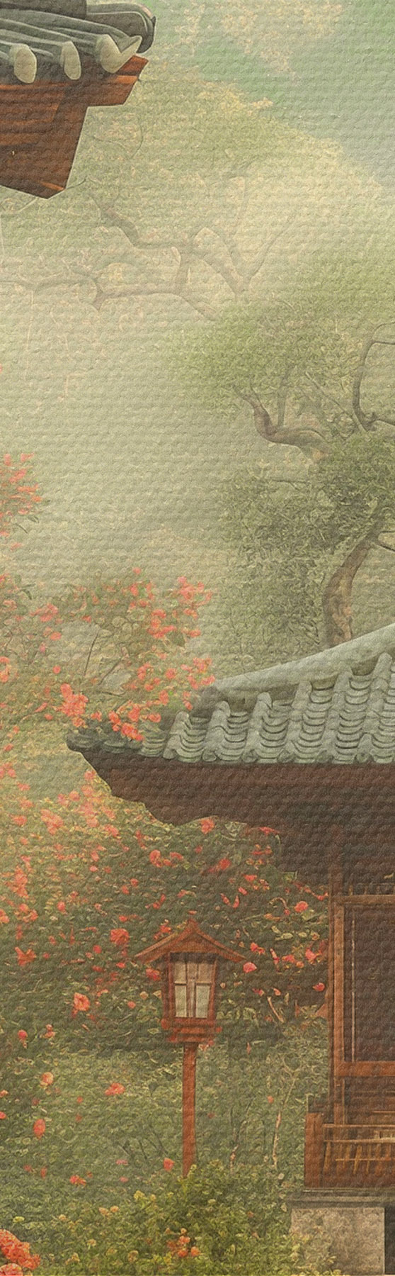 Maalid Jaapani park õitsvate puude ja lilledega, mets, puitmaja Nr s39773