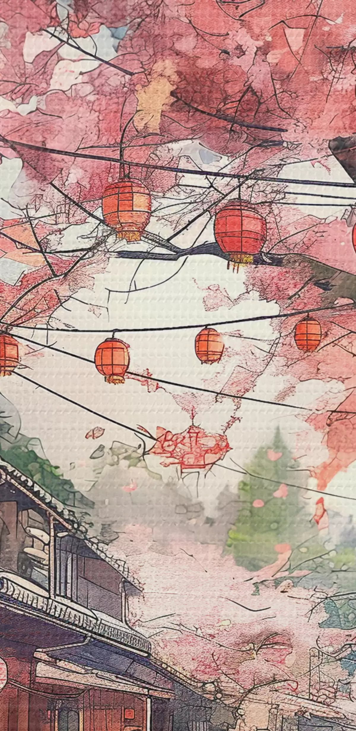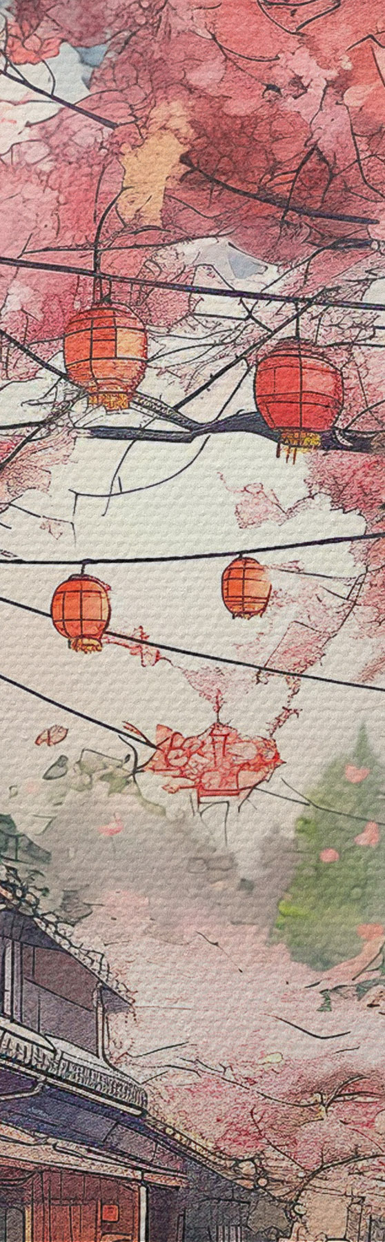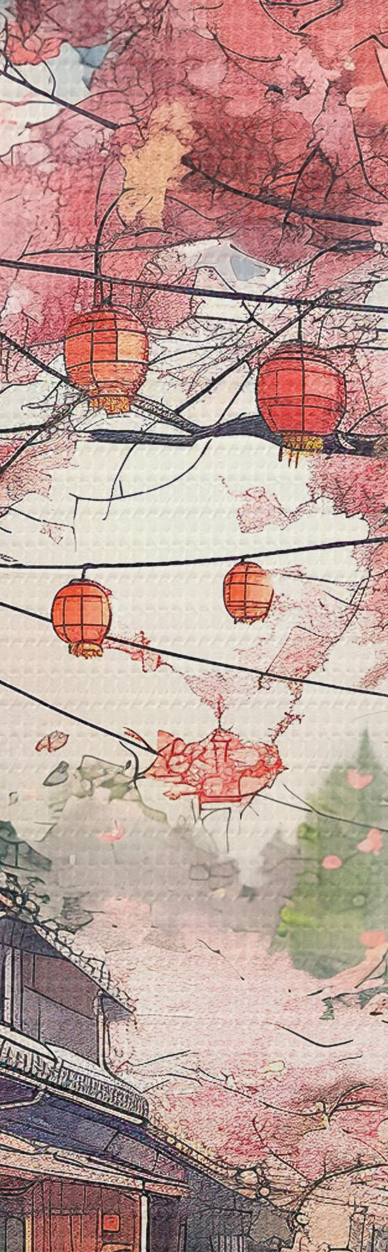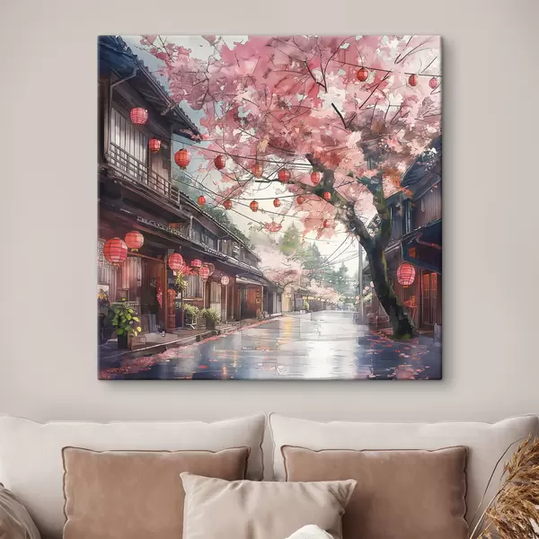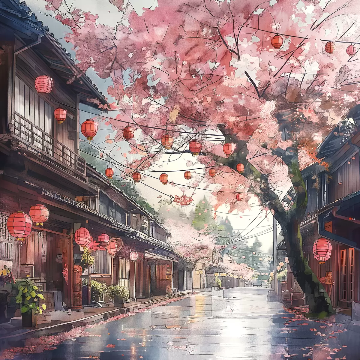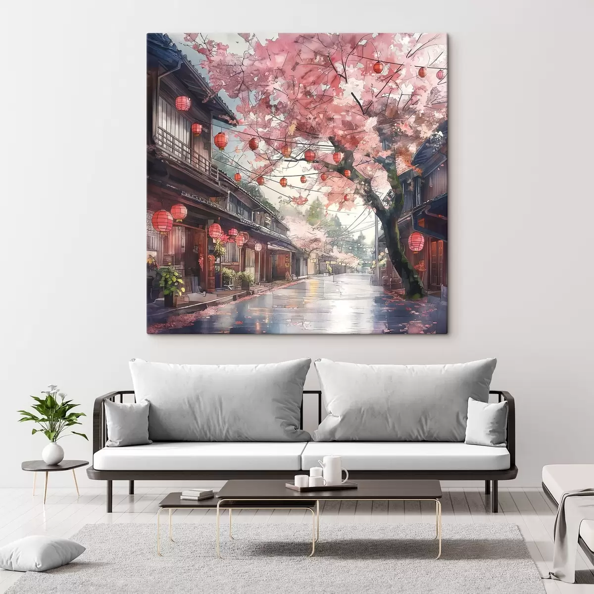 Maalid Jaapani tänav õitsvate kirsipuude, idamaise arhitektuuri, laternatega Nr s39774