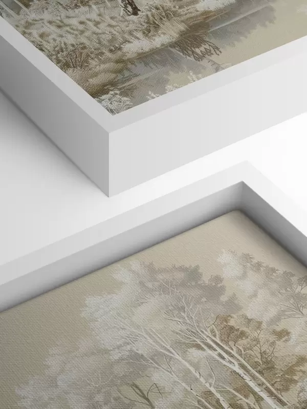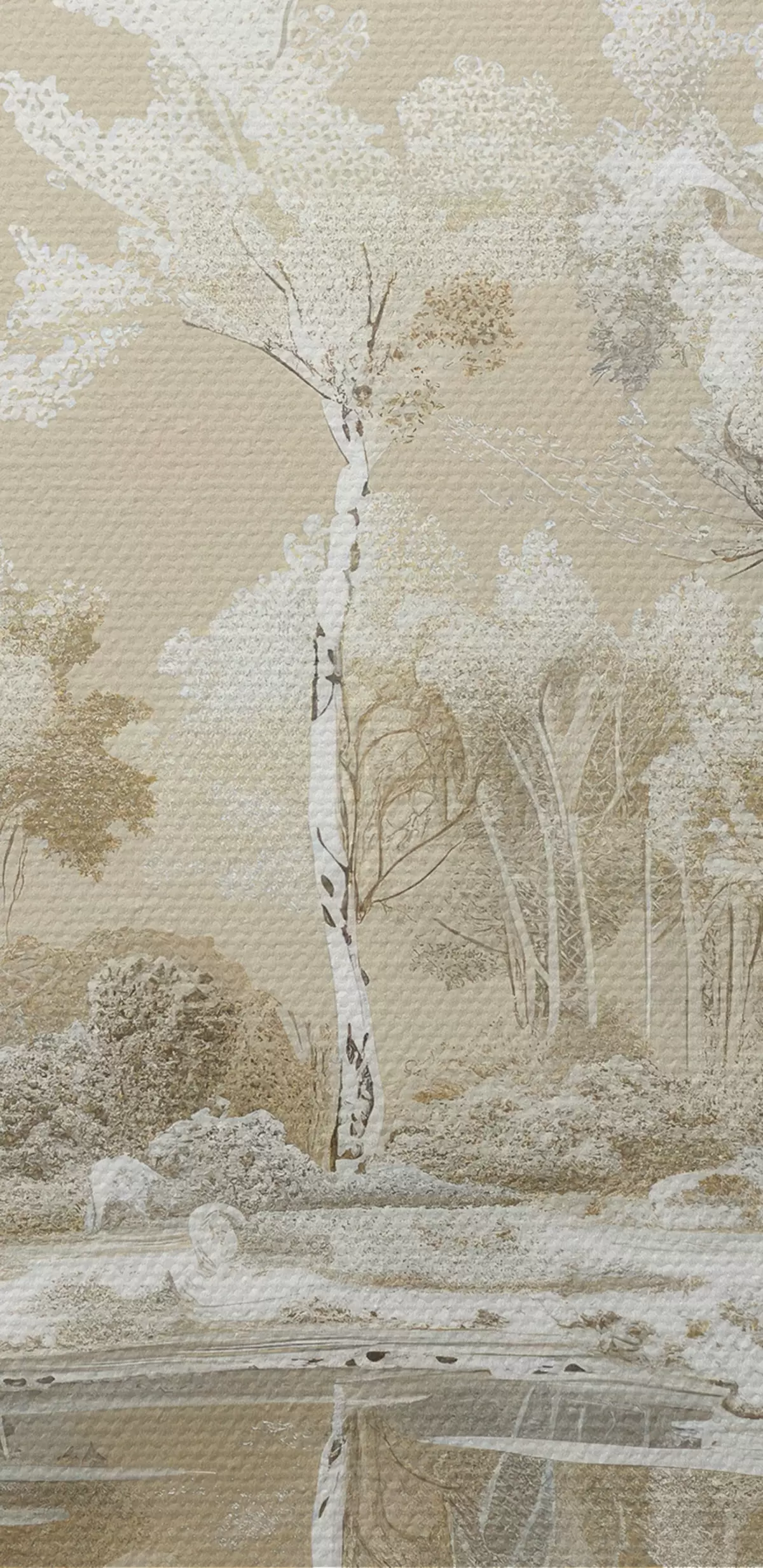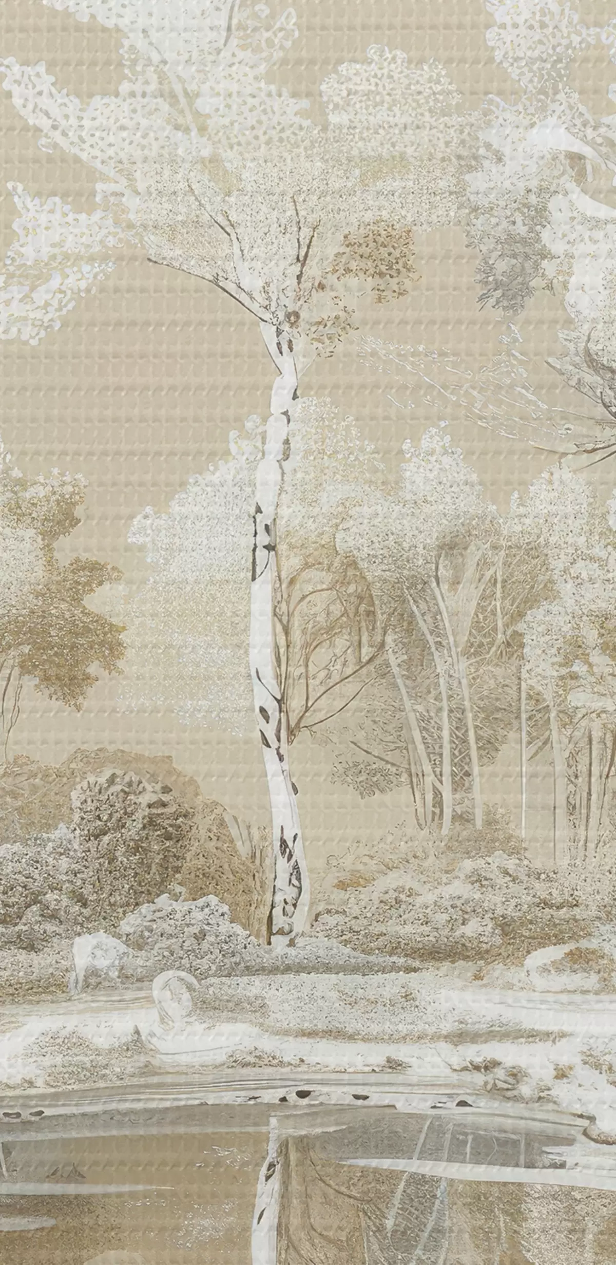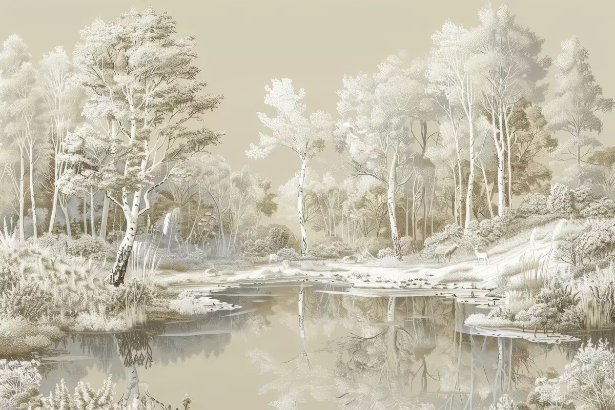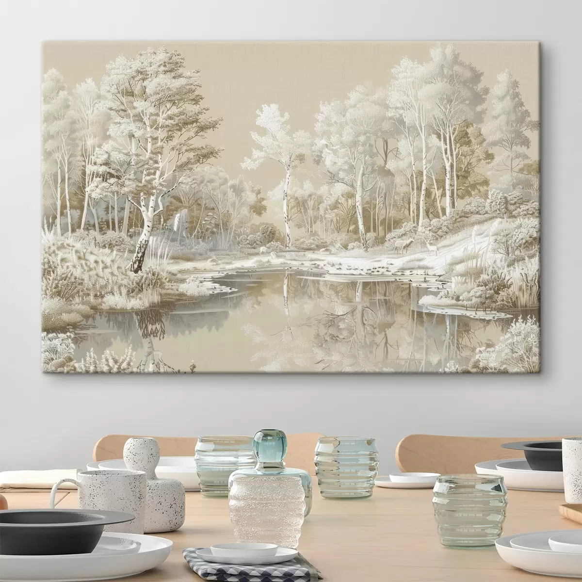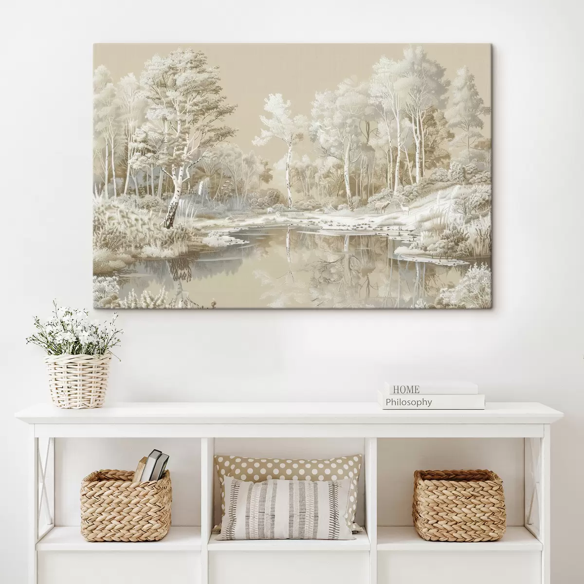 Maalid Kaunis metsamaastik, tiik ja puud, beežid ja valged värvid Nr s39979