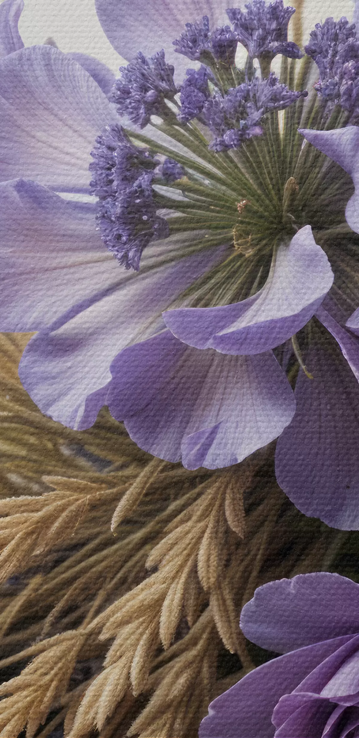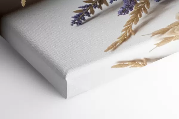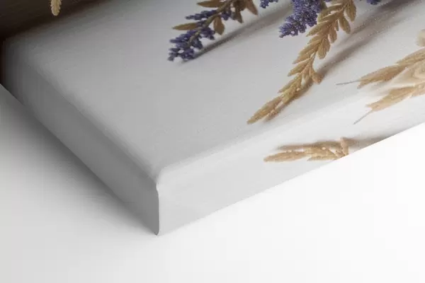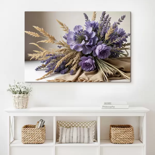 Maalid Lillade lillede kimp, sealhulgas pojengid ja lavendel, heledal taustal nisuvarred Nr s40030