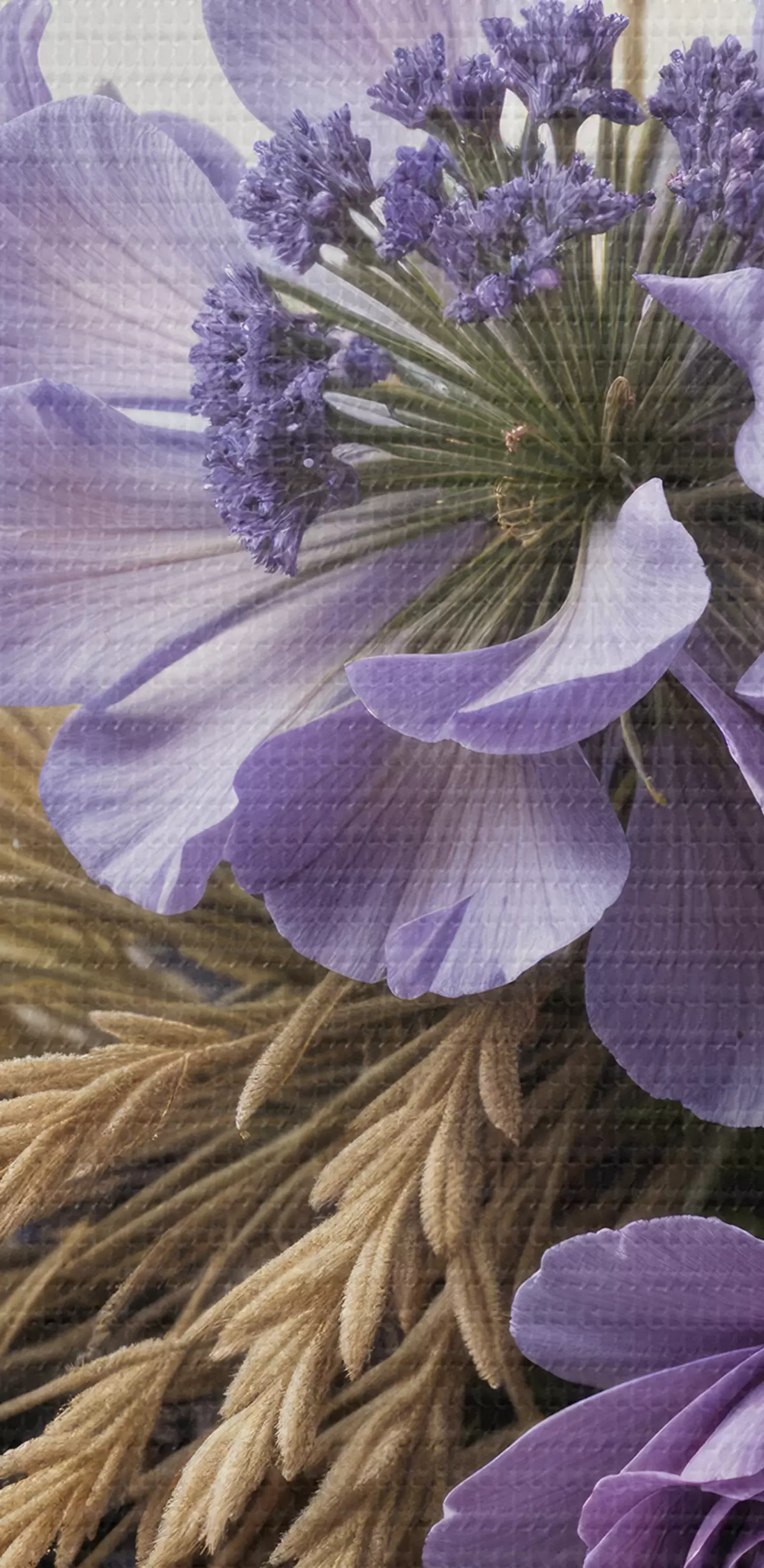 Pilt Lillade lillede kimp, sealhulgas pojengid ja lavendel, heledal taustal nisuvarred s40030