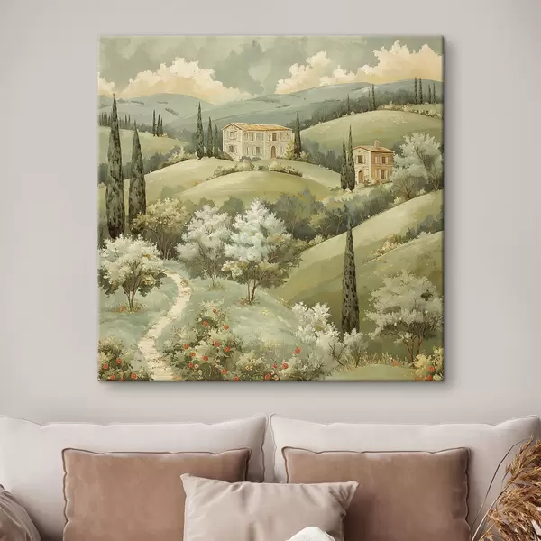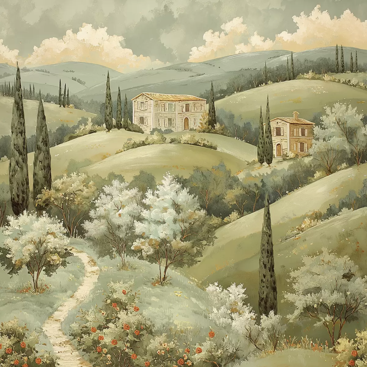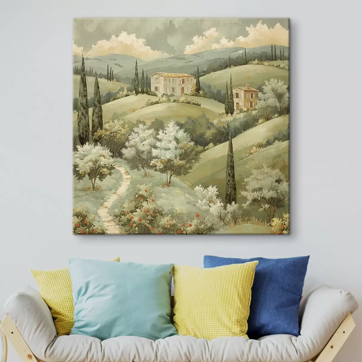 Maalid Maastik vintage majadega, pastellrohelised värvid, akrüüljoonistus, suvi Nr s40078