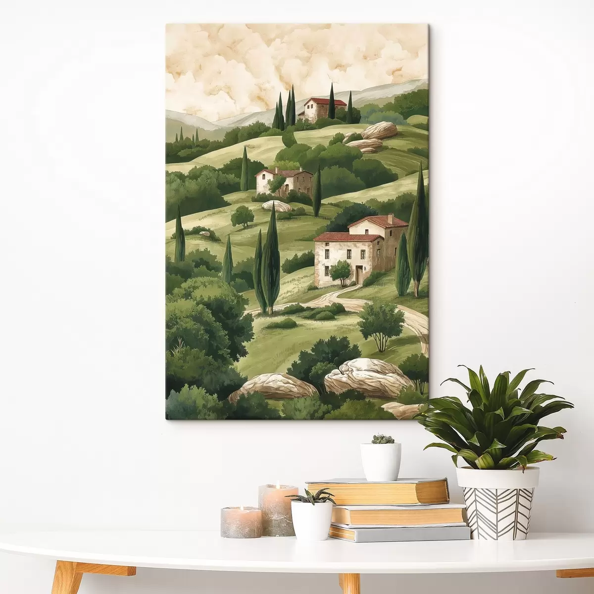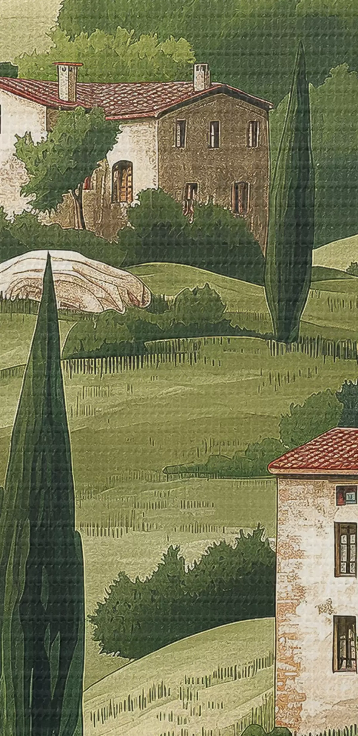 Maalid Maastik vintage majadega, pastelsetes rohelistes värvides, akrüüljoonistusega, maalähedane Nr s40080