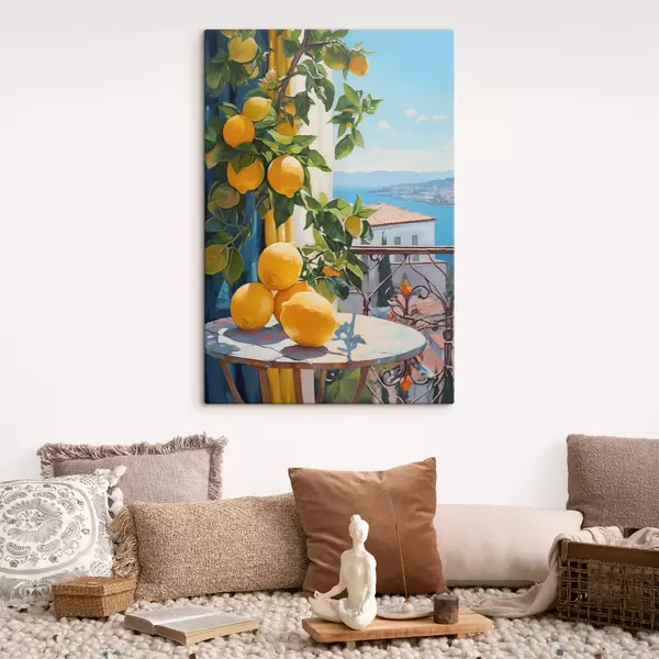 Maalid Sidrunid puul ja laud hotelli rõdul merevaatega õlimaali imitatsiooniga Nr s40091