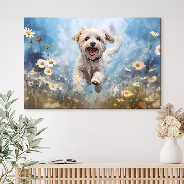 Maalid Väike valge koer hüppab karikakrate vahel sinisel akvarelli taustal Nr s40092