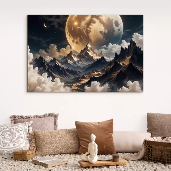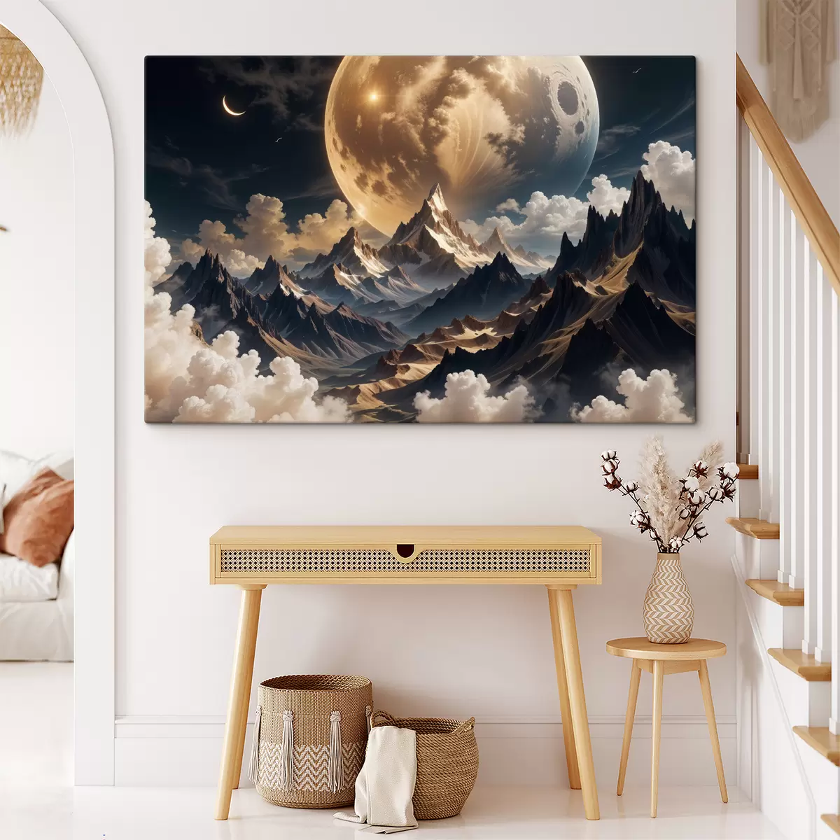 Maalid Sürrealistlik maastik lumiste mägedega massiivse täiskuu all ja vingete pilvedega Nr s40147