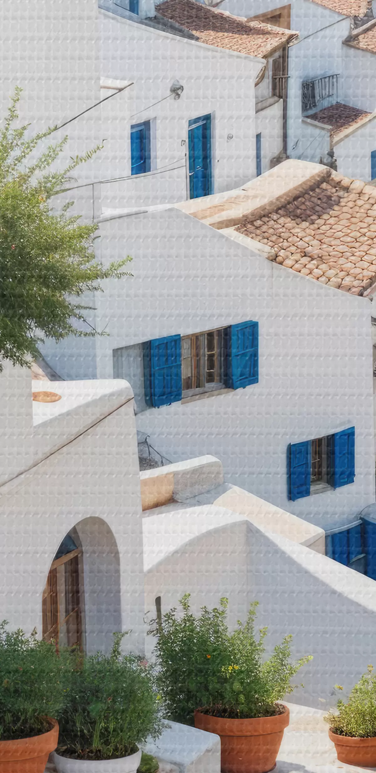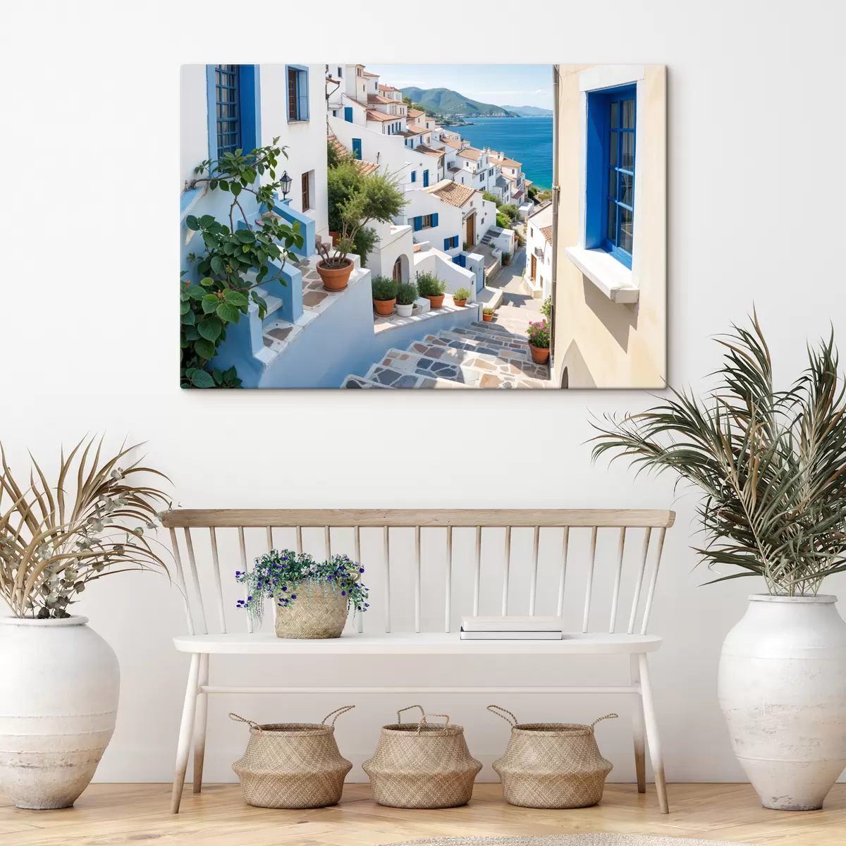 Maalid Maaliline rannikulinn valgete hoonete, siniste akende ja kitsaid tänavaid ääristavate potitaimedega Nr s40148