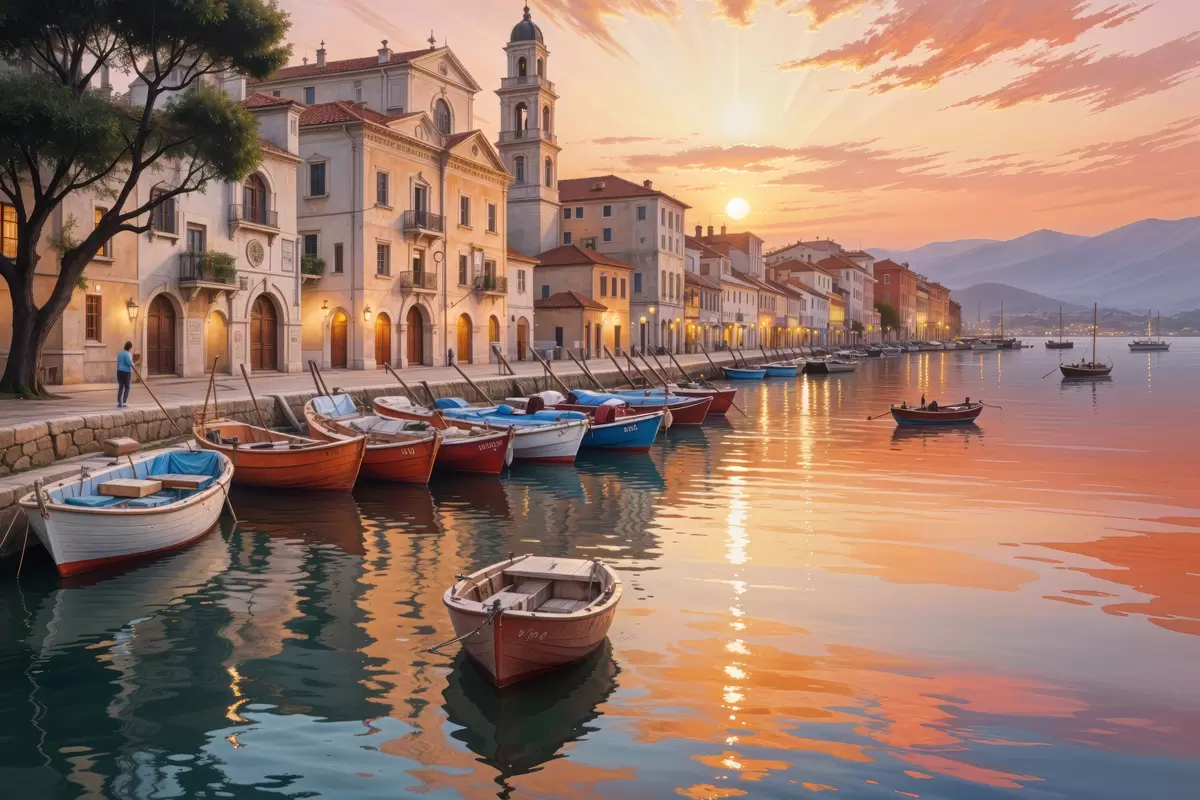 Maalid Itaalia rannikulinn päikeseloojangul, rannaäärt ääristavad värvilised hooned ja vaikses vees hõljuvad paadid Nr s40150
