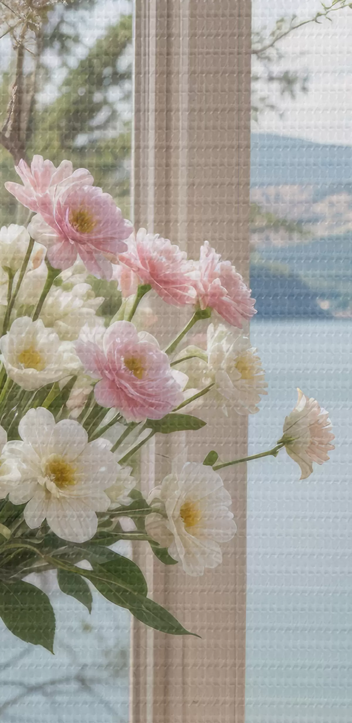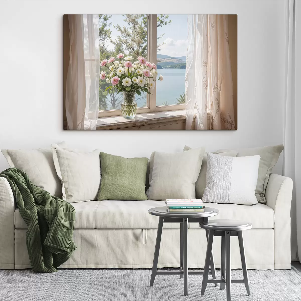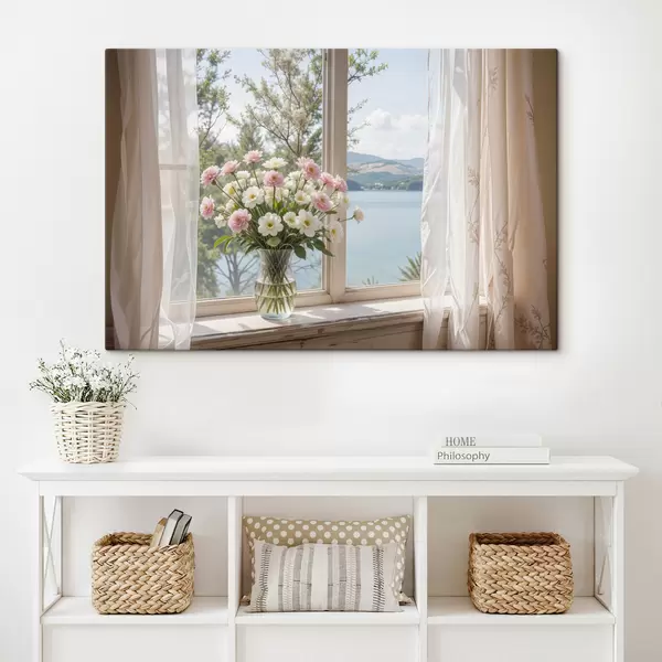 Maalid Roosade ja valgete lillede kimp aknalauale asetatud klaasvaasis maalilise järve ja mägedega Nr s40151