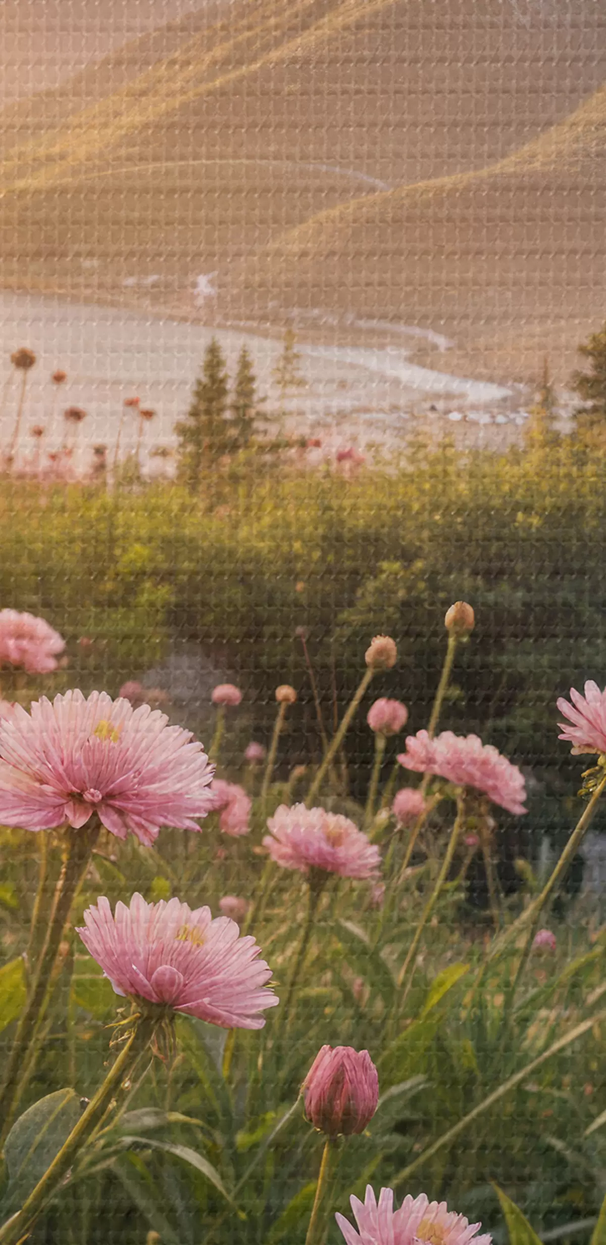 Maalid Esiplaanil roosade karikakrataoliste lillede väli, taamal suur mäeahelik Nr s40154