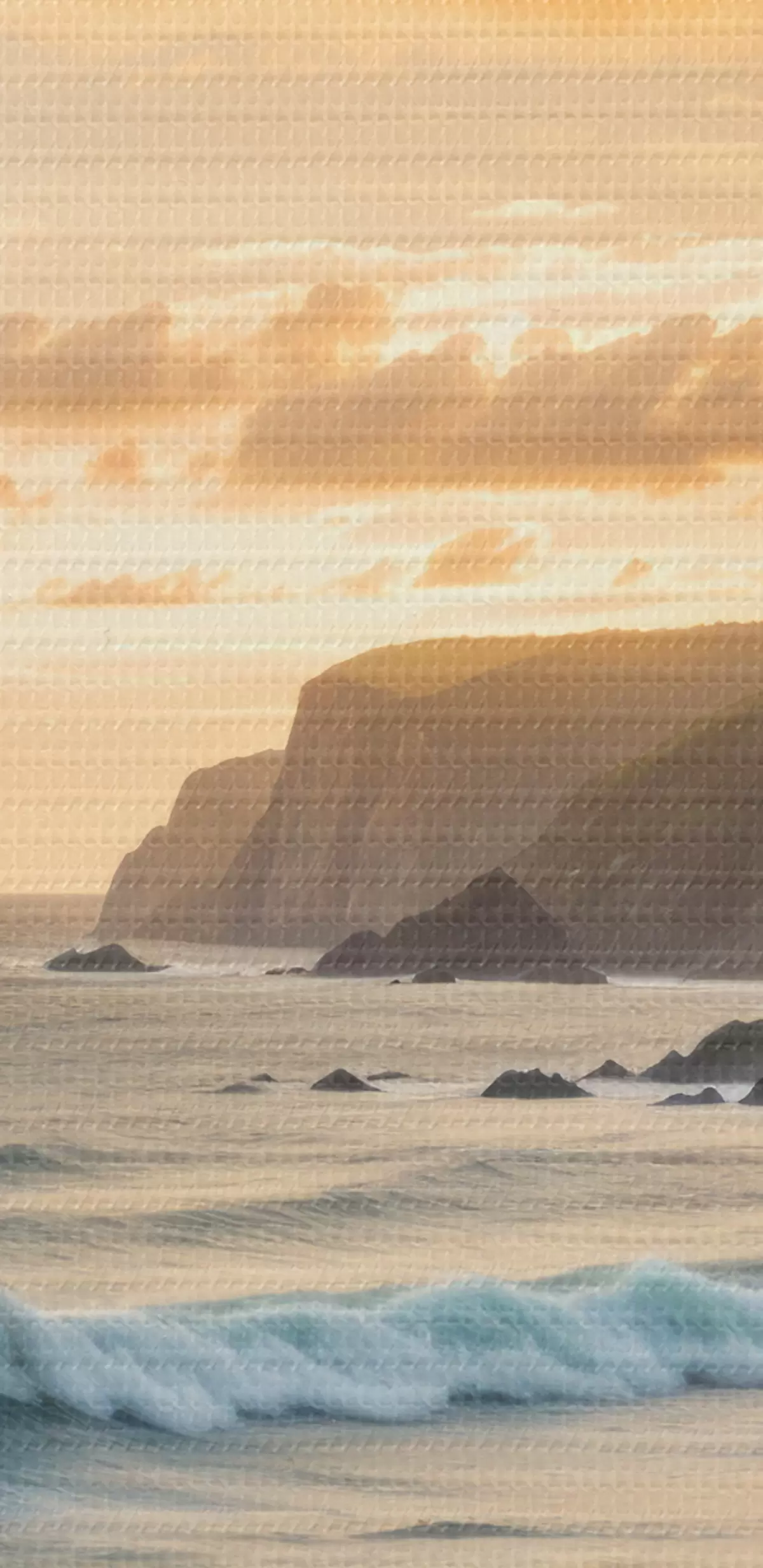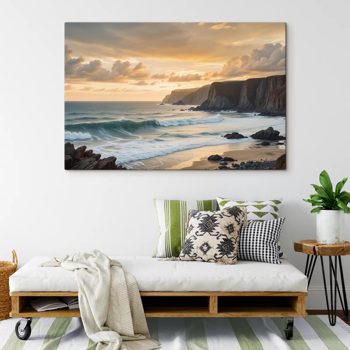 Maalid Maaliline rannikumaastik dramaatiliste kaljude, põrkuvate lainete ja värvilise päikeseloojangutaevaga Nr s40176