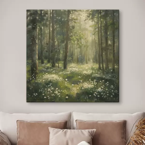 Maalid Mets päikesevalguse puude sees, kummeliõied, roheline muru, akrüüljoonistus Nr s40226