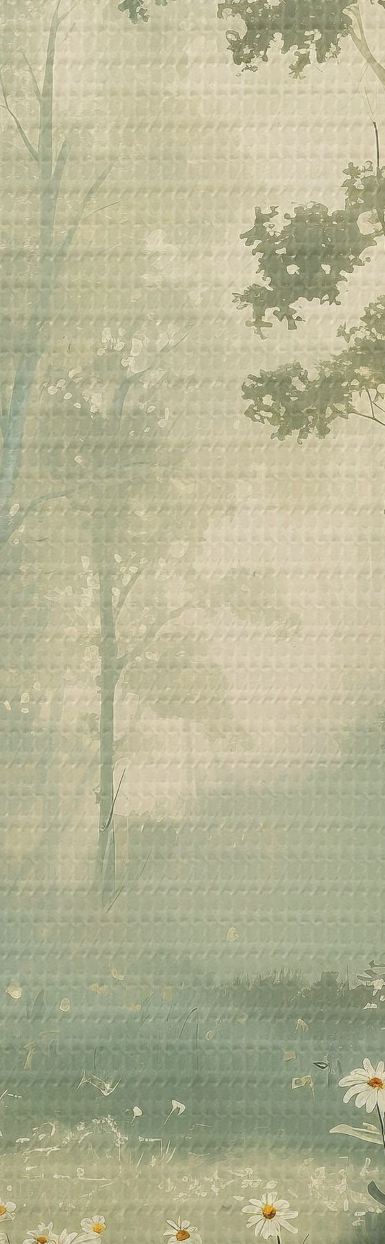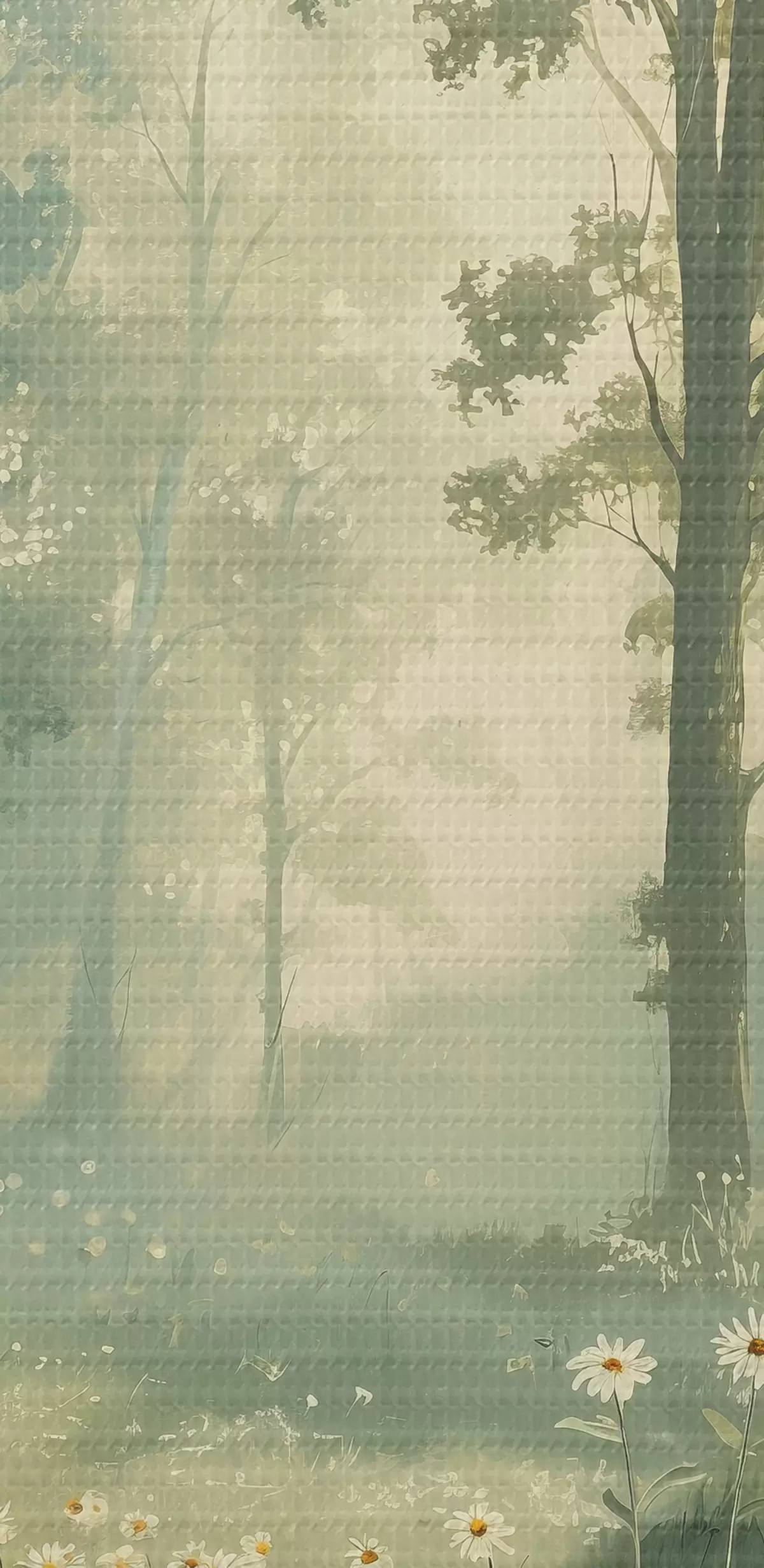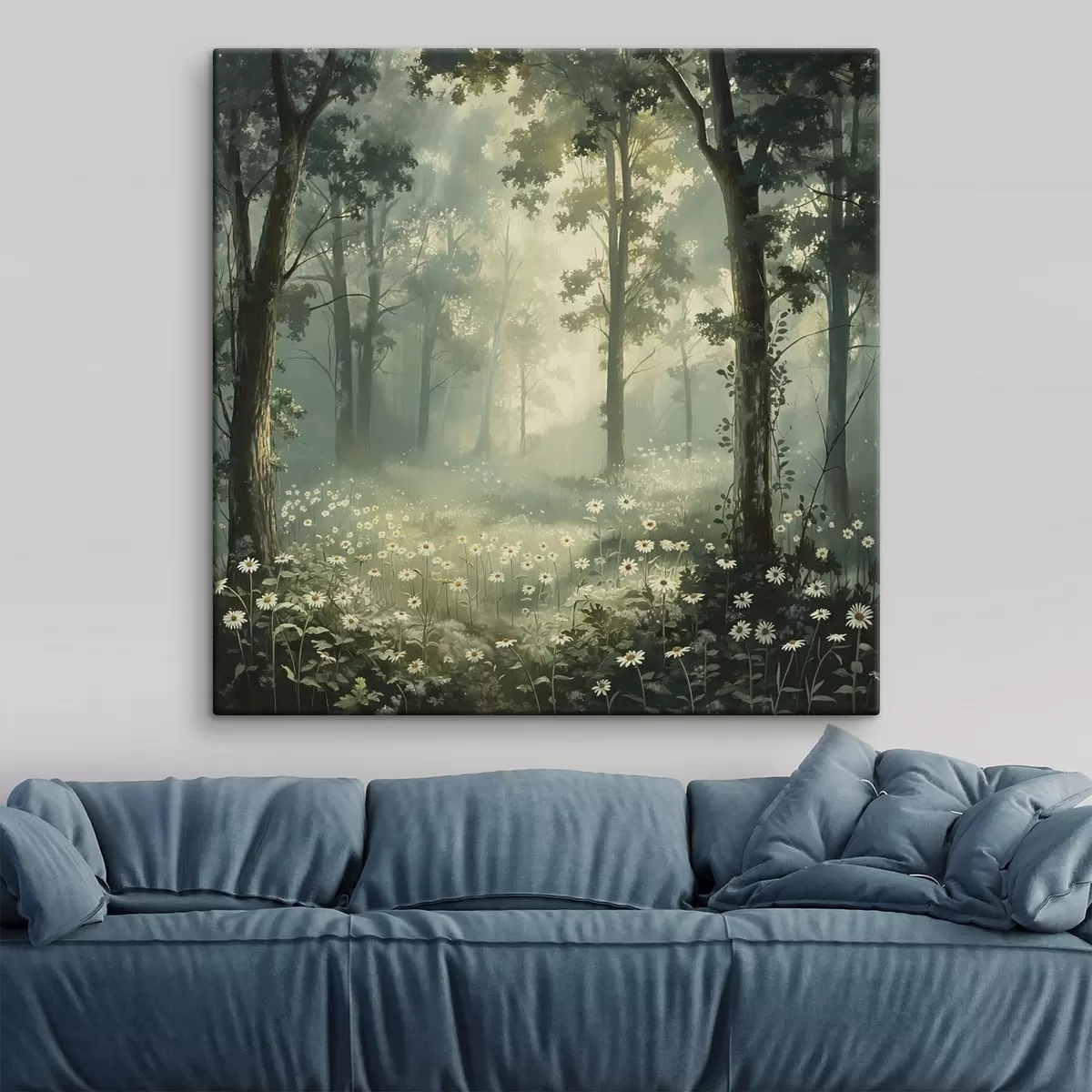 Maalid Pehme päikesevalgusega mets, kummeliõied, puud, roheline muru, akrüüljoonistus Nr s40228