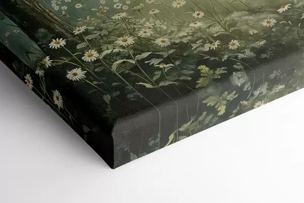 Maalid Pehme päikesevalgusega mets, kummeliõied, puud, roheline muru, akrüüljoonistus Nr s40228