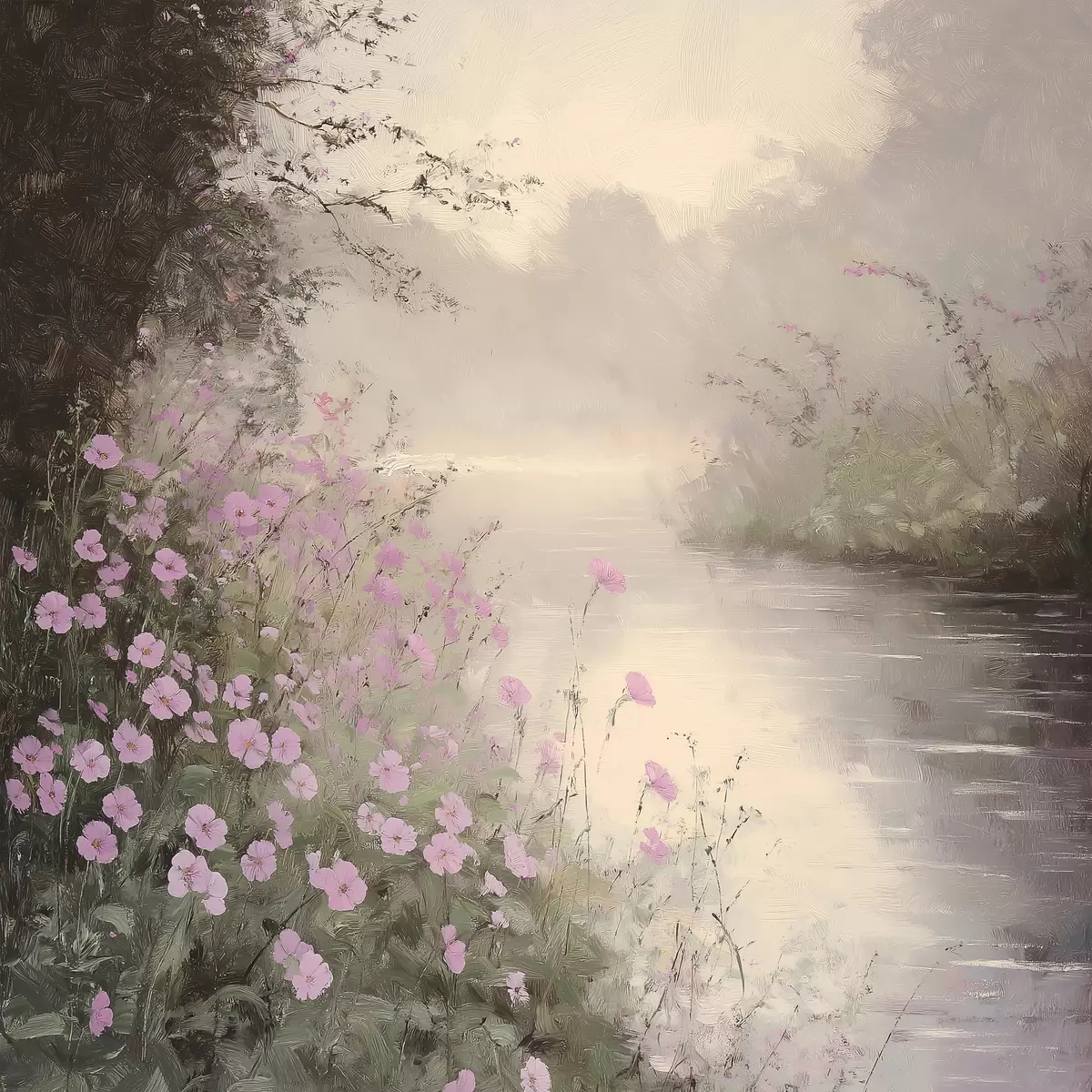 Maalid Roosade lilledega järv, päikesetõus, õlijoonis, pastelsed beežid värvid, udu Nr s40229