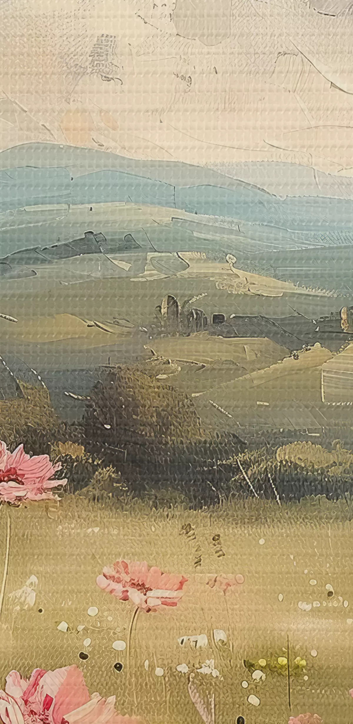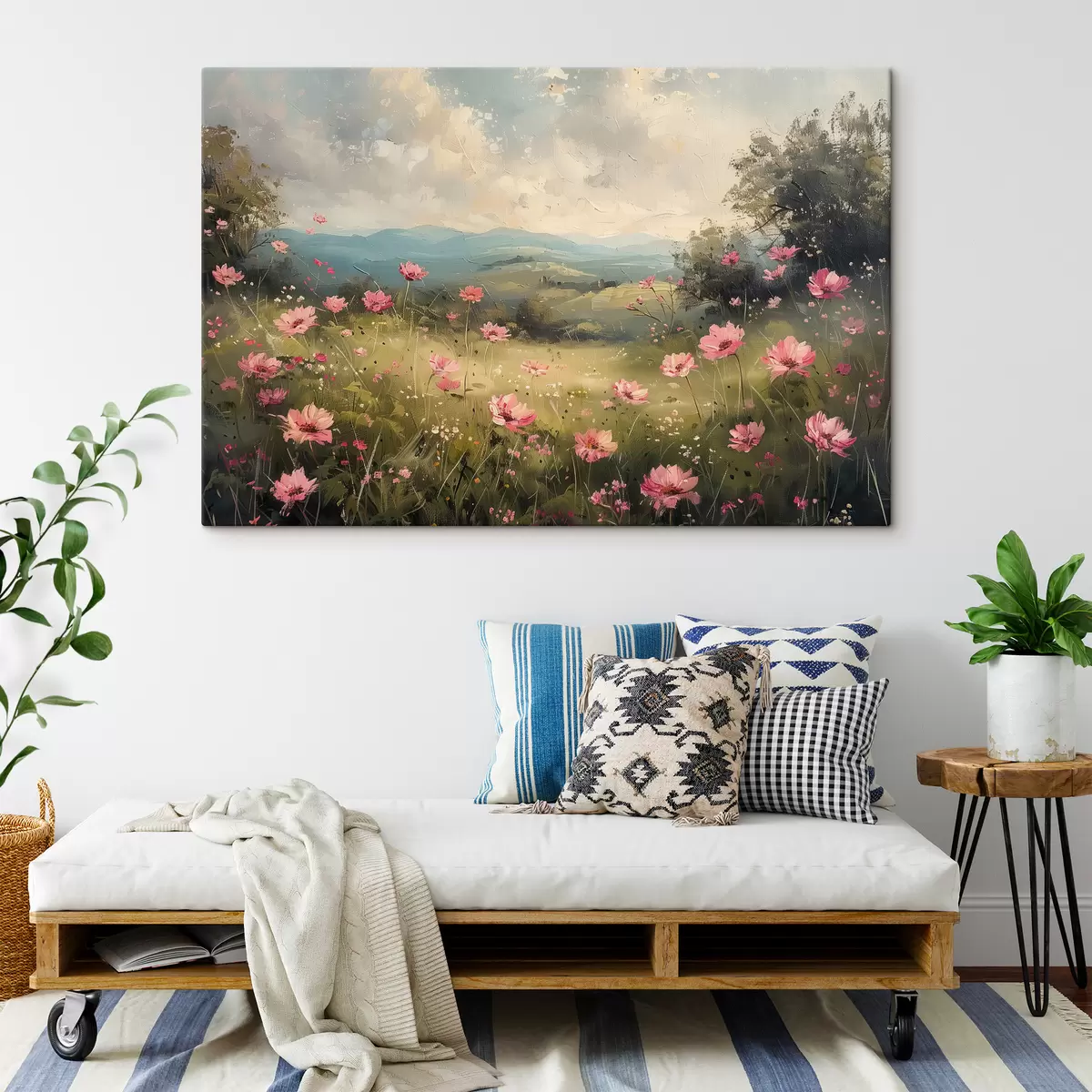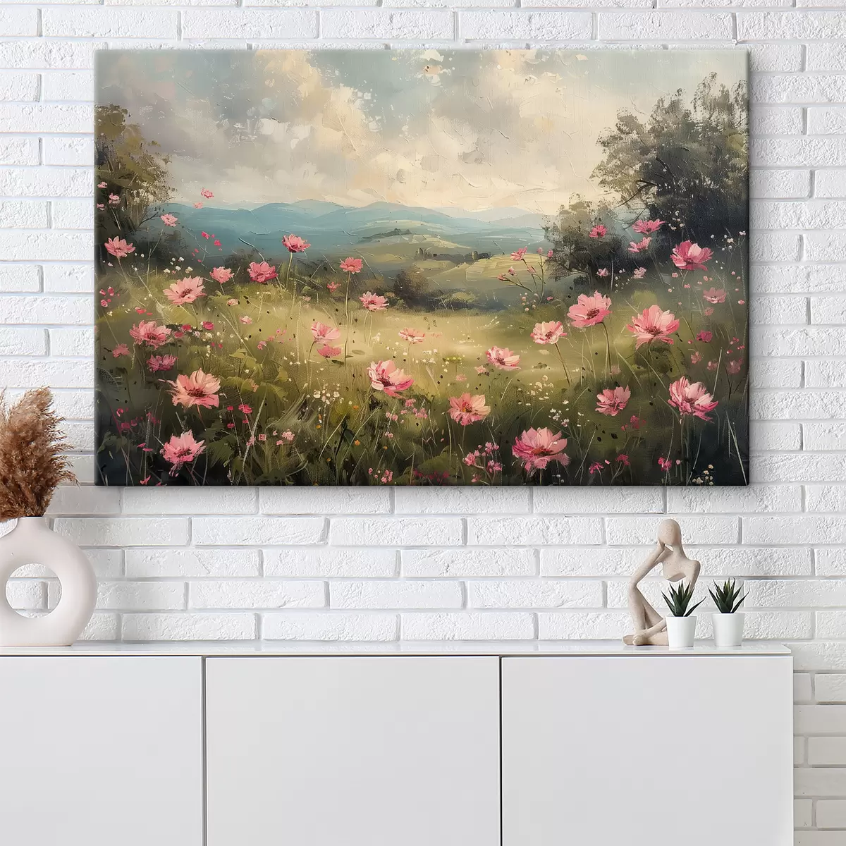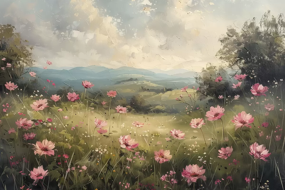 Maalid Roosade lilledega heinamaa, roheline muru, loodusmaastik, taevas pilvedega, akrüüljoonistus Nr s40234