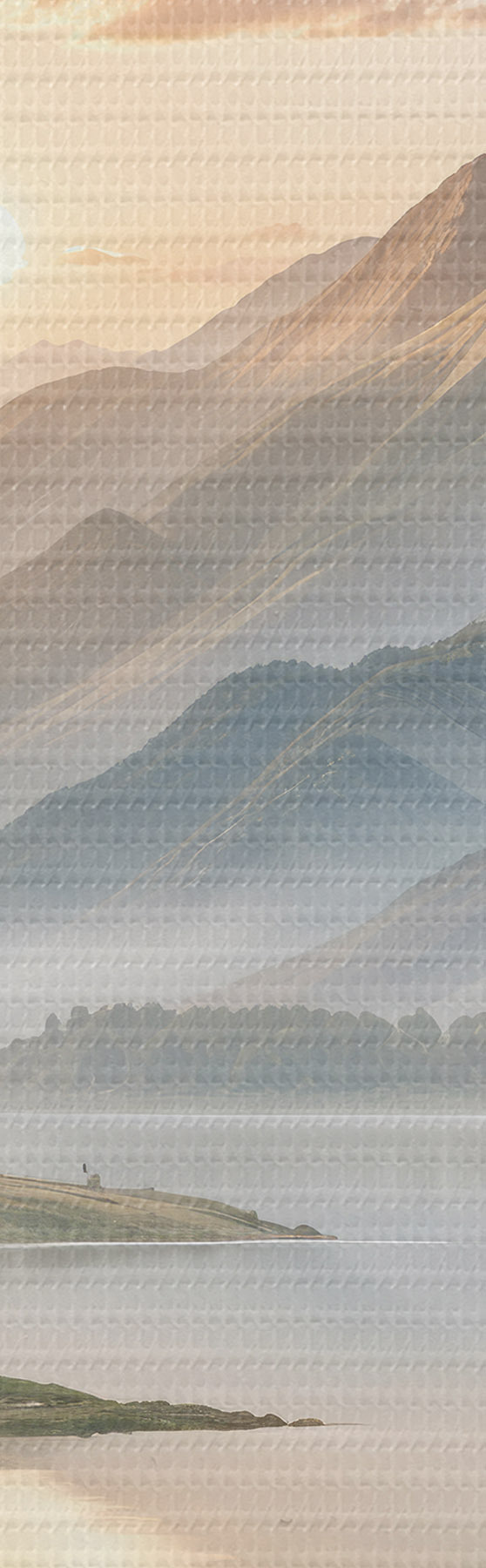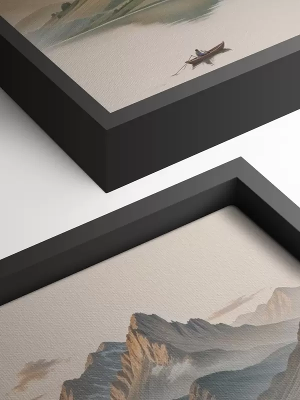 Maalid Rahulik maastik, mille taustal järv peegeldab mägesid ja väike paat vaiksel veekogul Nr s40391