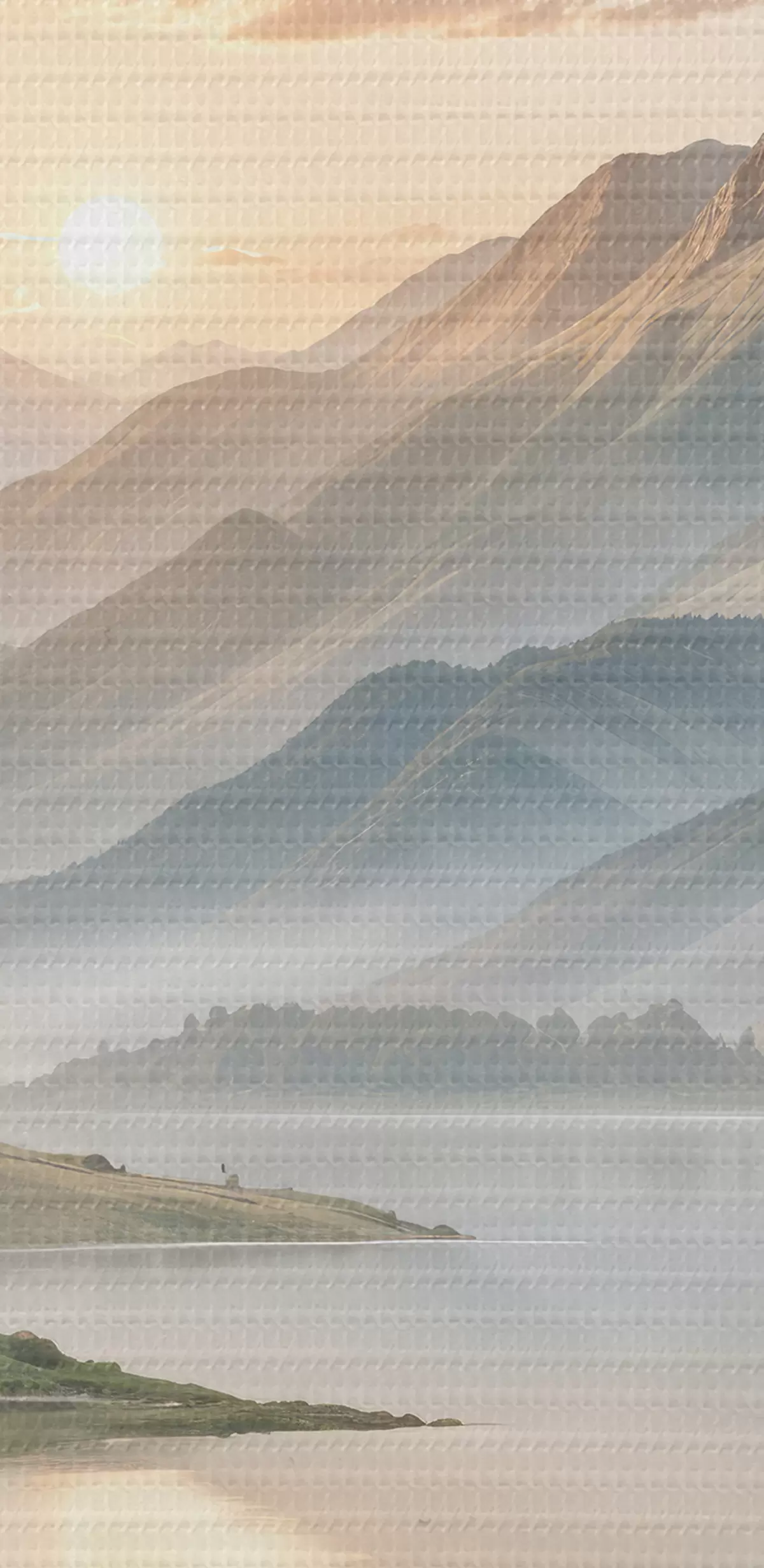 Maalid Rahulik maastik, mille taustal järv peegeldab mägesid ja väike paat vaiksel veekogul Nr s40391