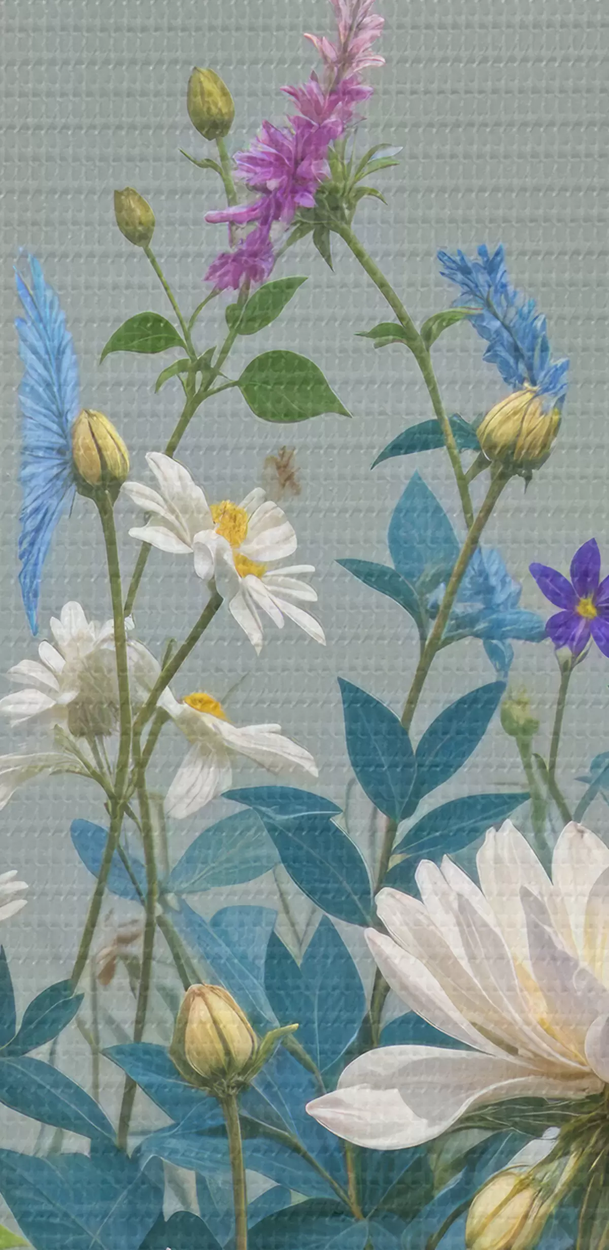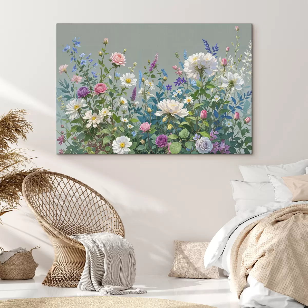 Maalid Lopsakas elav aed, mis on täis erinevaid värvilisi lilli ja õitsvaid taimi hallil taustal Nr s40393