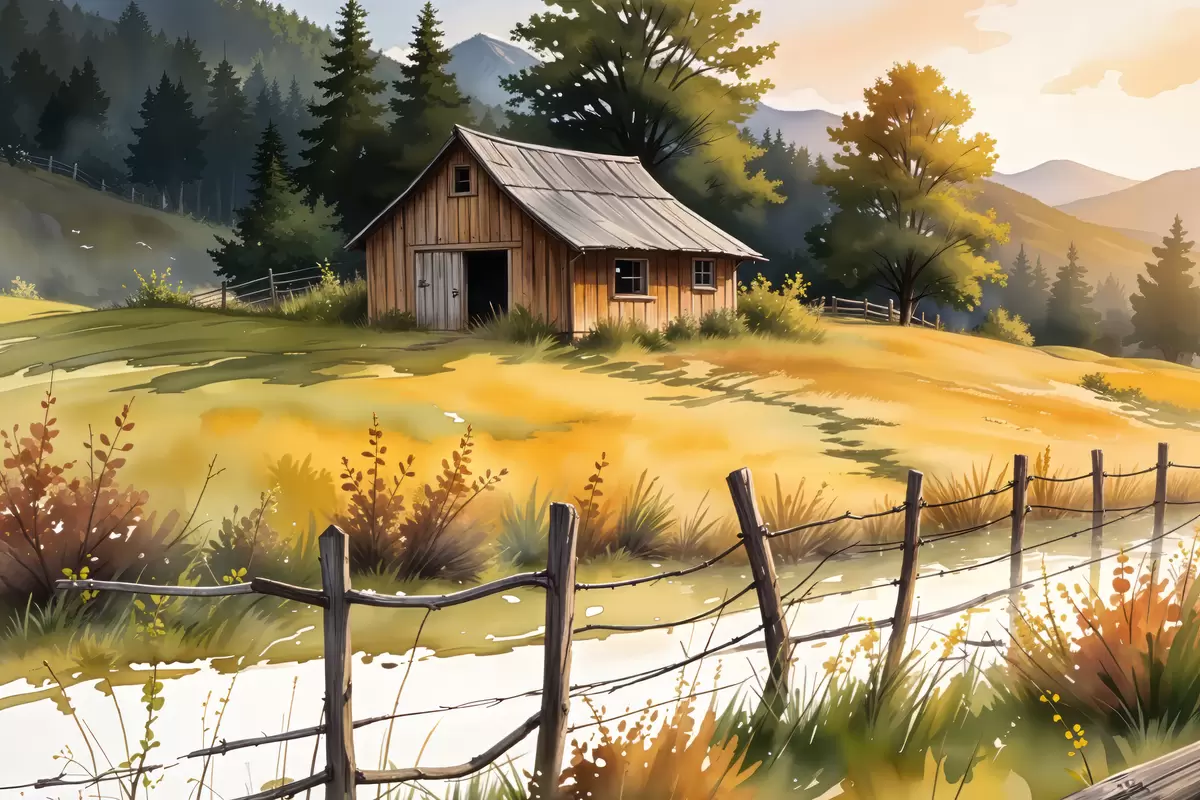 Maalid Vana puumaja maapiirkonnas, ümbritsetud rohuväljade, männipuude ja mägedega Nr s40394