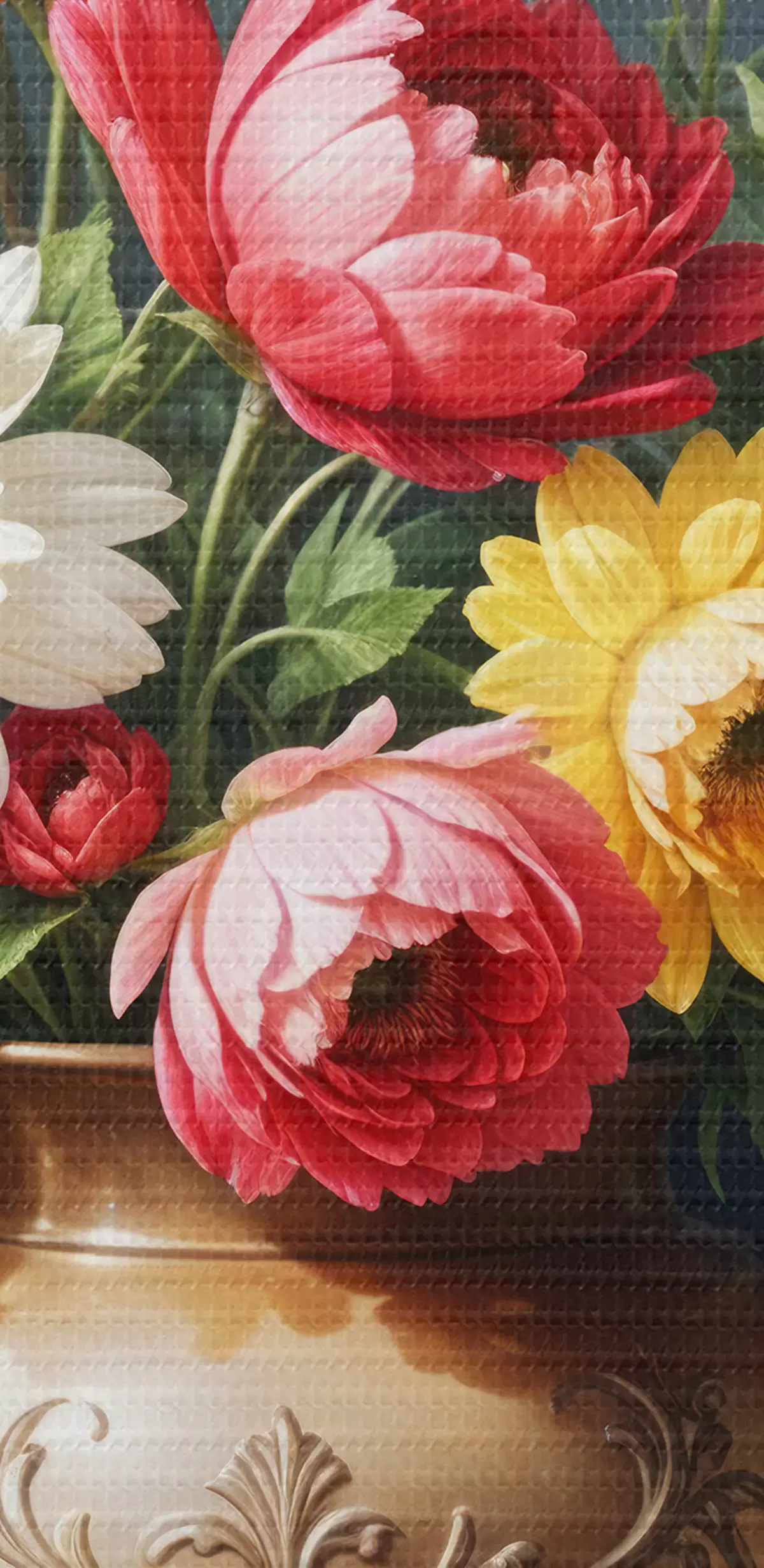 Maalid Elav maal värviliste lillede kimbust, sealhulgas punased roosid, kollased nartsissid ja valged karikakrad Nr s40395