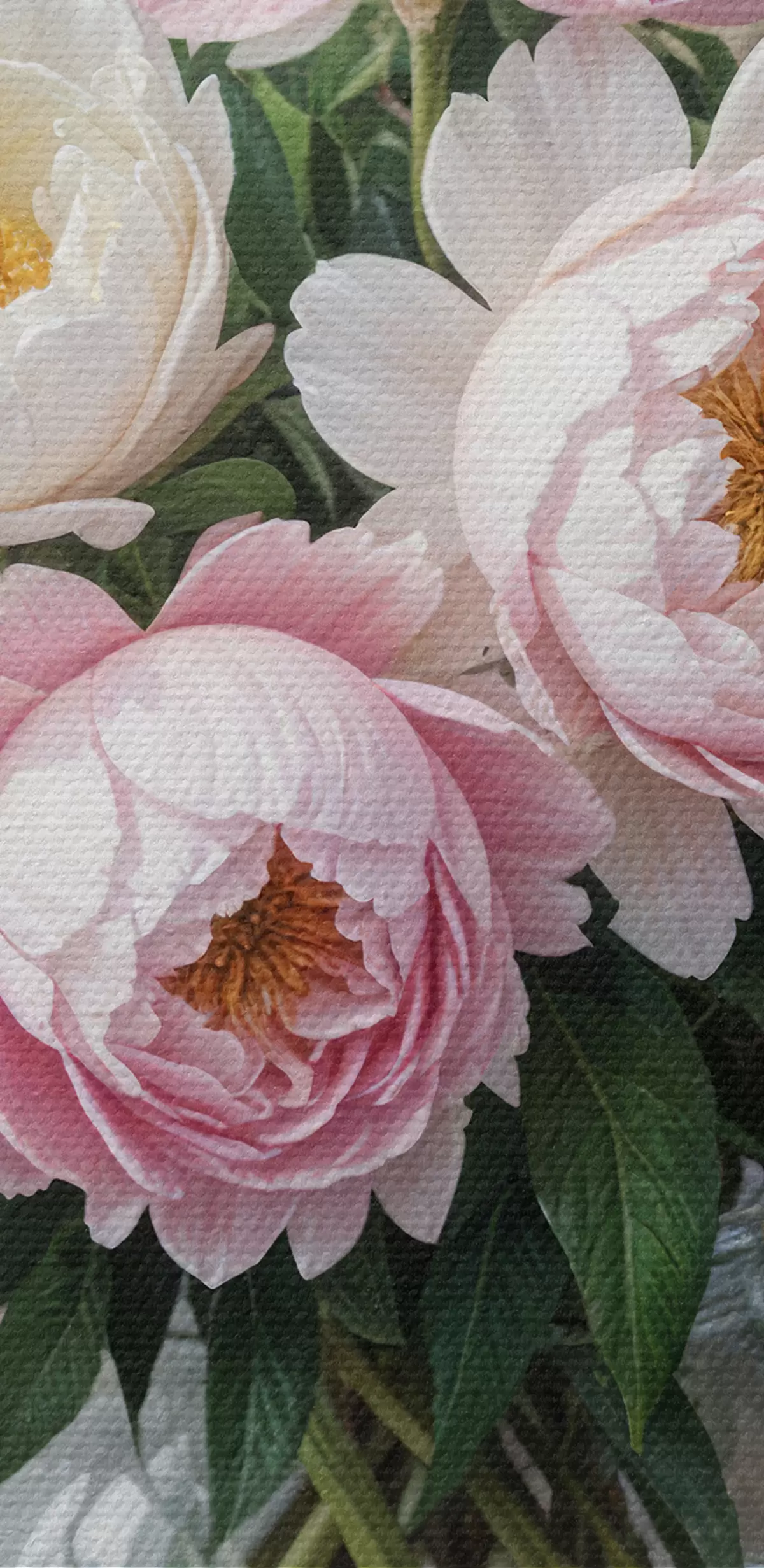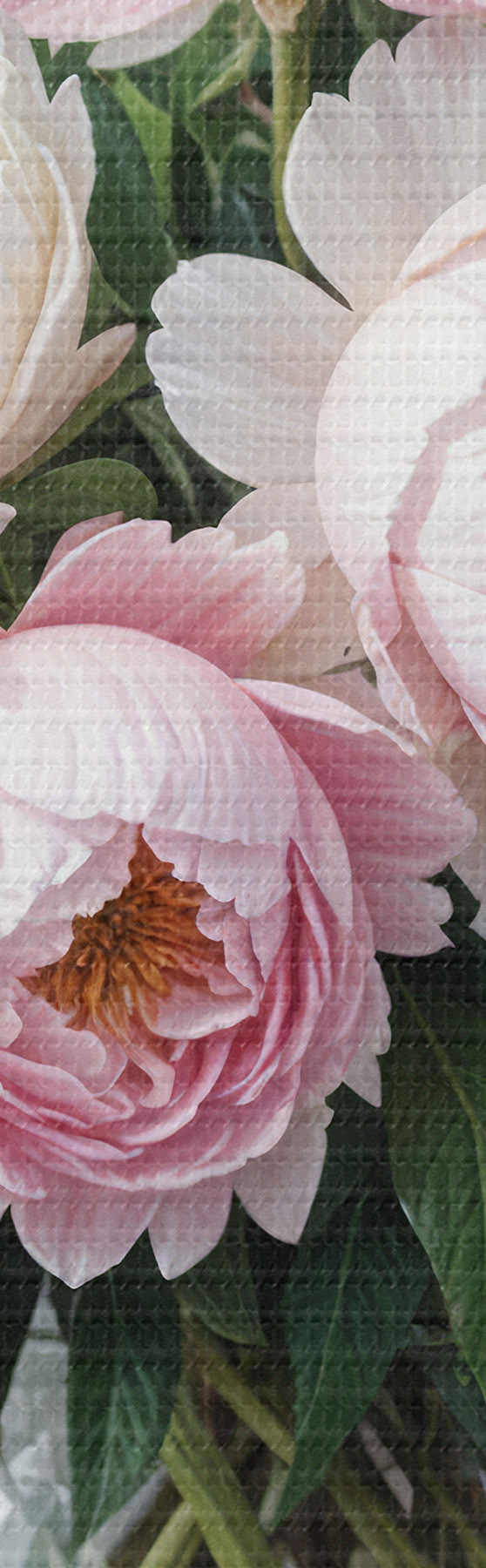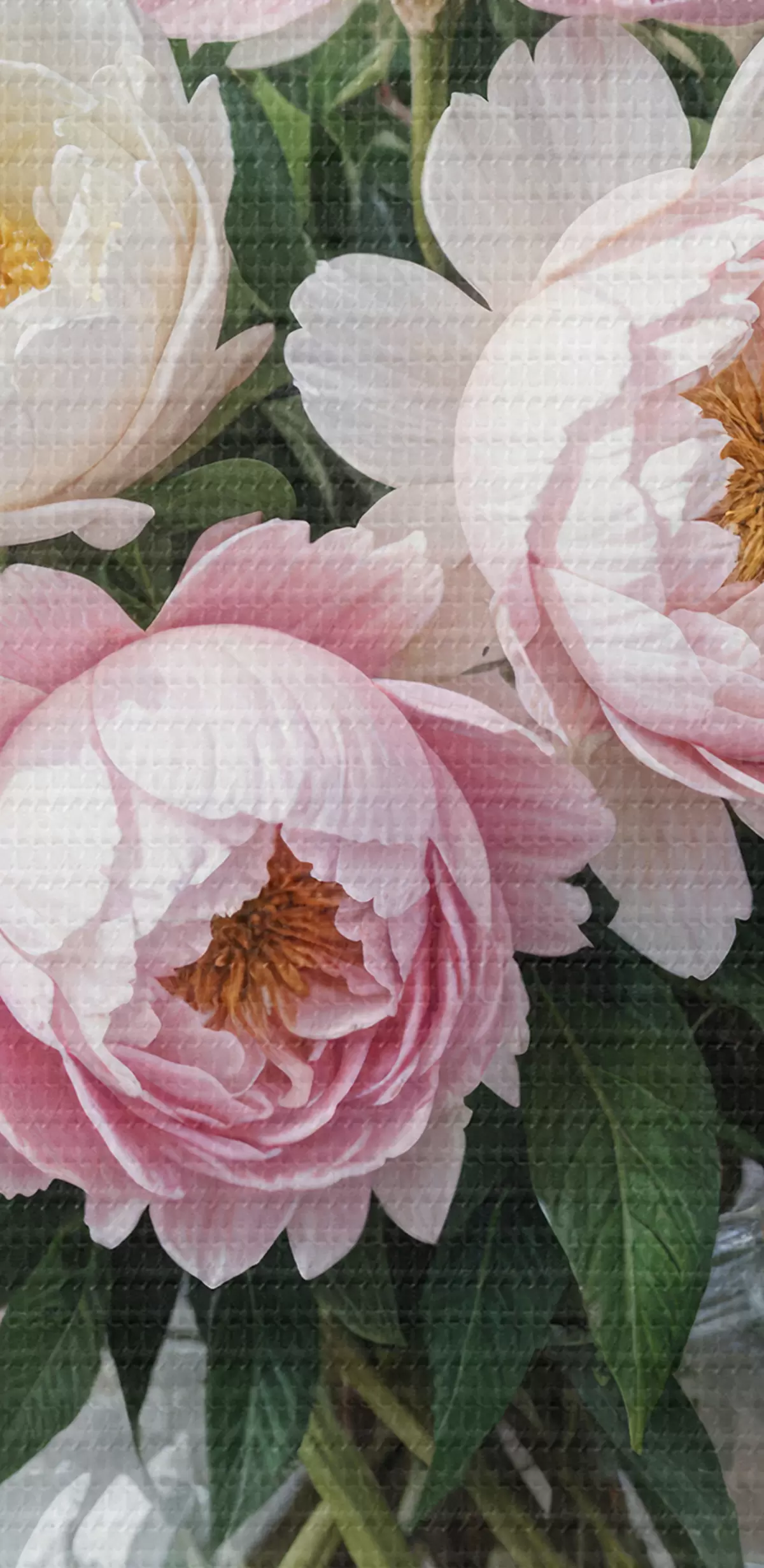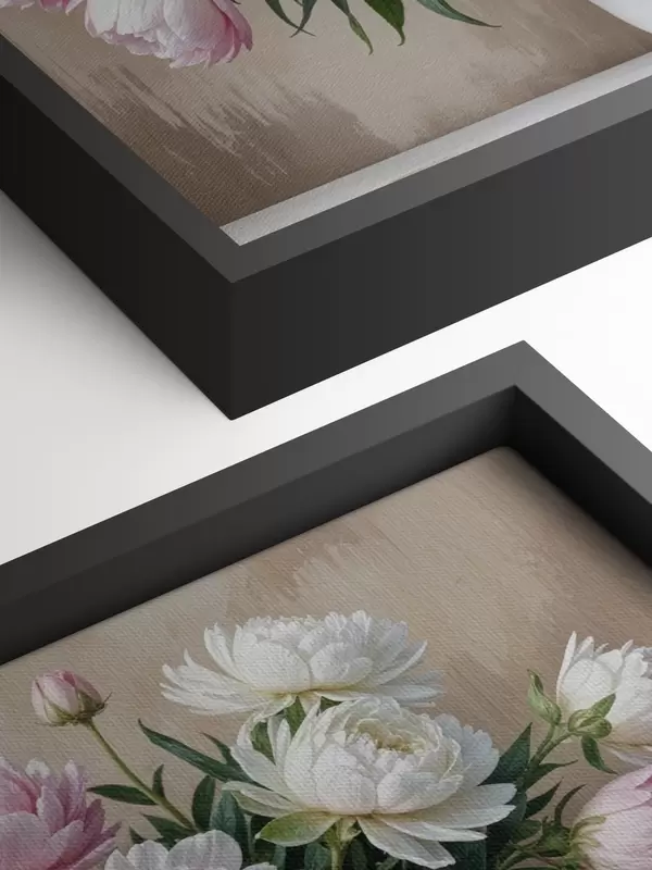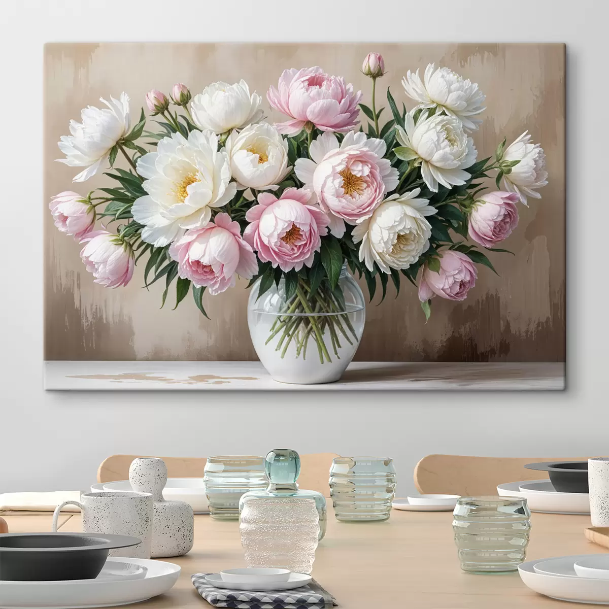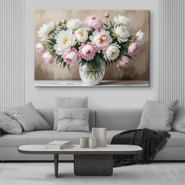 Maalid Puitpinnale paigutatud klaasist vaasis kaunite roosade ja valgete pojengide kimp Nr s40398