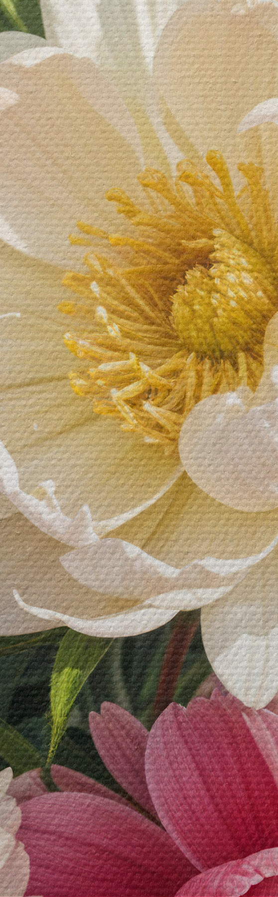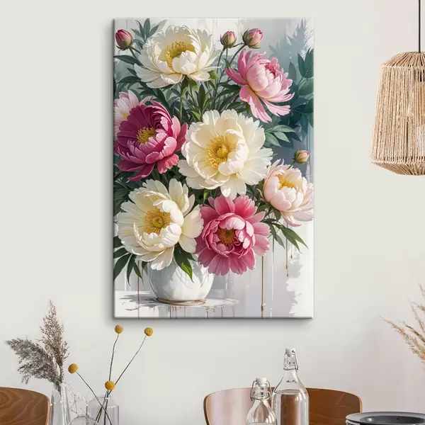 Maalid Erinevates roosade, valgete ja kollaste toonides elavate pojengide lillekimp koos värvipritsmetega Nr s40403